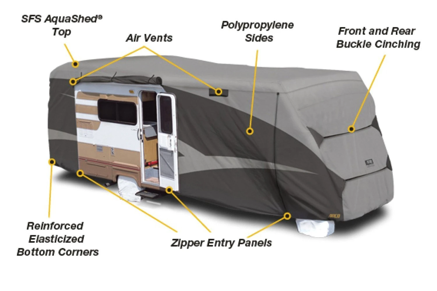 SFS AquaShed™ Designer Gray Class C Motorhome Cover (Gray, Up to 23′) (52842) by ADCO®. This product is made of high-quality materials to serve you for years to come. Designed using state-of-the-art technology and with customers in mind. It will meet your needs and deliver great quality at an affordable cost.