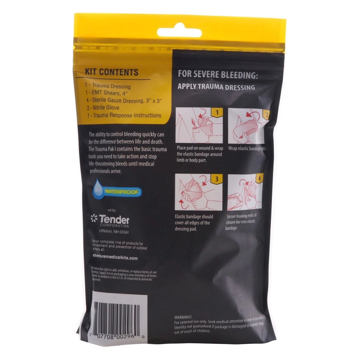 1 Person Trauma Pak by Adventure Medical Kits®. Be prepared for emergencies whether you’re at home, on the job, or out and about. The Trauma Pak I gives you the power to stop bleeding with the basic trauma tools and medical supplies you need to take action until medical professionals arrive. This compact trauma kit features a WoundStop™ trauma dressing, which combines a trauma pad and gauze to apply direct pressure and stop potentially fatal blood loss, reducing the risk of shock. This clinically-proven wrap from Persys Medical can be self-applied and includes a closure bar to keep the dressing securely in place. Inside the trauma pack, you’ll also find emergency essentials like EMT trauma shears to help you access the wound, nitrile gloves for personal protection, and gauze dressings to help manage the wound. The resealable, waterproof DryFlex™ trauma bag keeps these vital contents safe and ready to use and can be used to dispose of bio-waste. Add the Trauma Pak I to your personal trauma kit, first aid kit, backpack, or glove box for an affordable bleeding control kit you can count on when any trauma occurs.