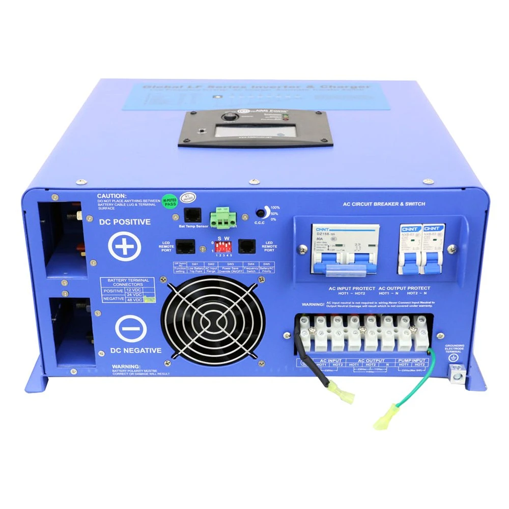 10000W Pure Sine Inverter Charger by AIMS Power®. With 48V DC/240V AC Input & 120/240V AC Split Phase Output. This inverter will output 120 or 220/230/240Vac, and it can output 50 or 60Hz via the SW4 switch on the DC side of the product. This means that this inverter works internationally and is operable with nearly any electrical system on the planet! Built with a 48 volt DC input, this inverter performs with very little power loss. Users receive a notable increase in efficiency in large systems when compared to using 12 or 24 volts, which can be an attractive feature for sustainability lovers looking to live as efficiently as possible.