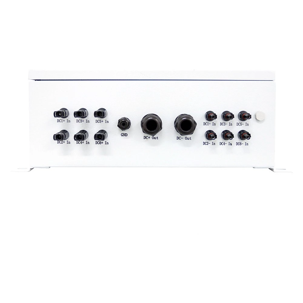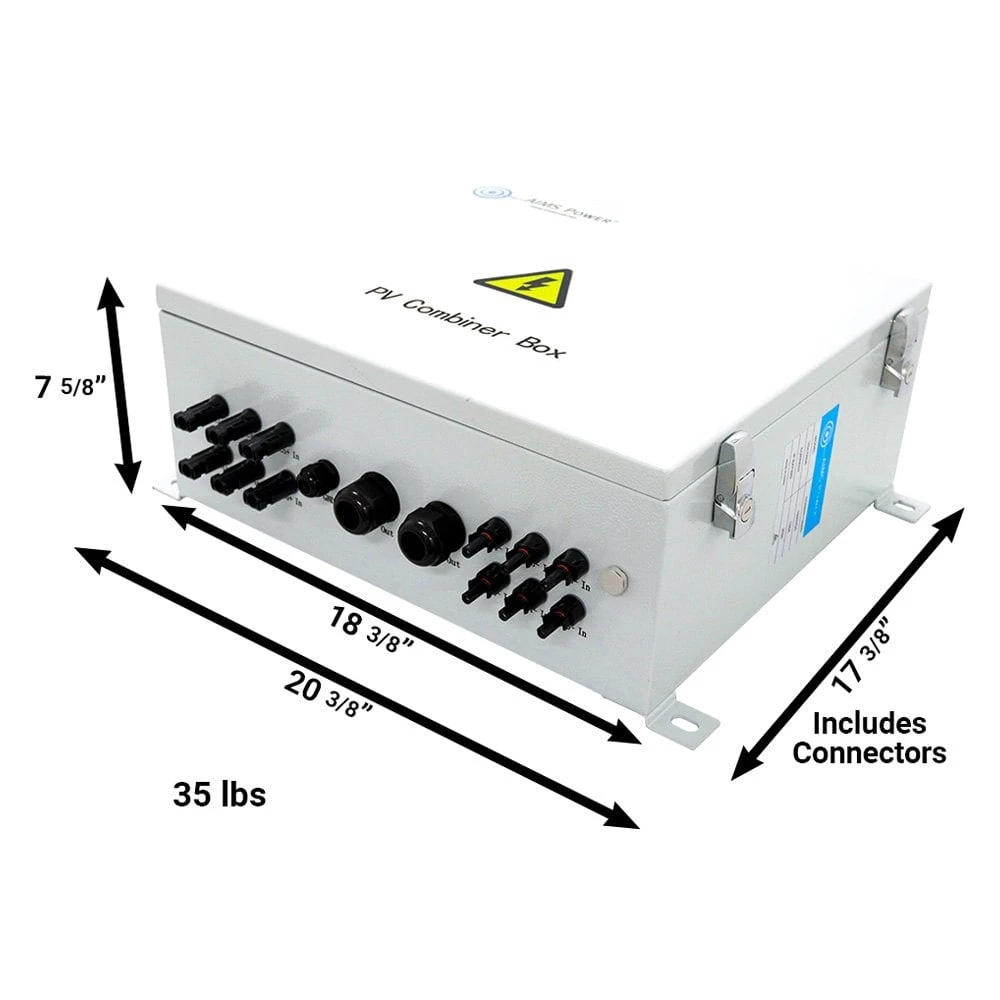 120A 200V DC 6 String 20KW Prewired Solar Array Combiner Box by AIMS Power®. The AIMS Power Solar Array Combiner Box provides a convenient solution for large PV solar array installations. The Combiner Box is exactly that… a box that serves as a central location for multiple input to a single output load. At 10KW/20KW output and 200Vdc input, this pre-wired box, with MC4 input and output connectors and a NEMA waterproof case is a must have for off-grid and grid tied systems.