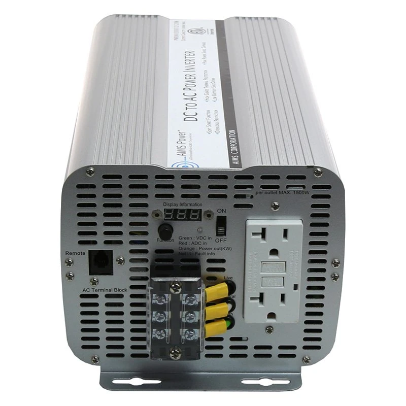AIMS has produced a high quality unit that is also available in two other sizes 2000 and 3600 watts. It features a 20 amp GFCI outlet. That is exactly like the outlets you find in your bathroom and are able to be reset if they “pop” for safety. This inverter also has a direct connect AC terminal block, which delivers the full 3000 watts to a single source. The compact design is lightweight and durable, taking up less space in your work environment.