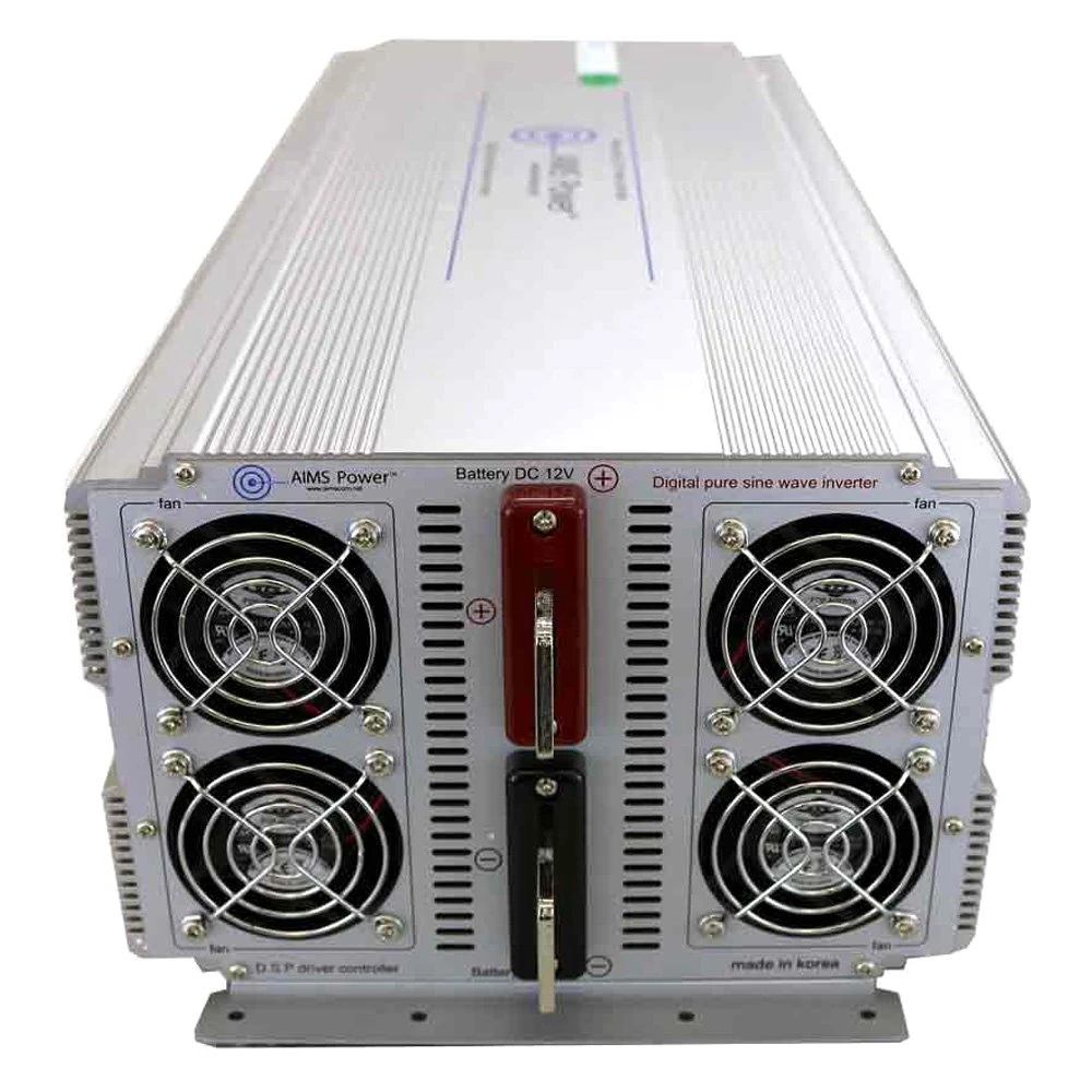 5000W 12V 50/60Hz Industrial Pure Sine Inverter by AIMS Power®. AIMS Power is proud to bring you this new 5000-Watt Pure Sine Power Inverter. Designed for harsh environments, it has been completely overhauled. This AIMS 5000-watt inverter now boasts a dual GFCI outlet and is FCC certified. This product also includes a thermally controlled fan, meaning it delivers increased efficiency with less noise. It will continue to put out stable, pure sine power and maintain output voltage even as your battery bank voltage decreases.
