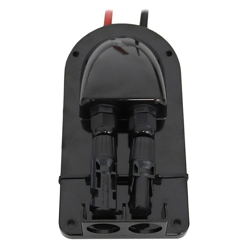 Solar MC-4 Compatible Roof Mount Weatherproof 2-Wire Cable Entry with 10″ Leads by AIMS Power®. The AIMS Power 2 wire roof mount cable entry provides a quick and efficient way to connect solar wires in an RV, boat or any vehicle needing solar. The cable entry minimizes cable exposure, providing extra protection, resulting in a neat solar install. Secure connection Easy click and use design with the included MC-4 Compatible connectors and leads – minimal labor Includes 10″ positive and negative leads (male & female) Easy to install – flexible entry point on your RV or vehicle Weatherproof – UV resistant Durable.
