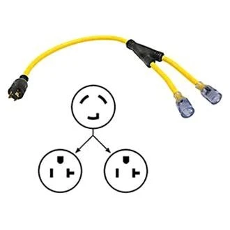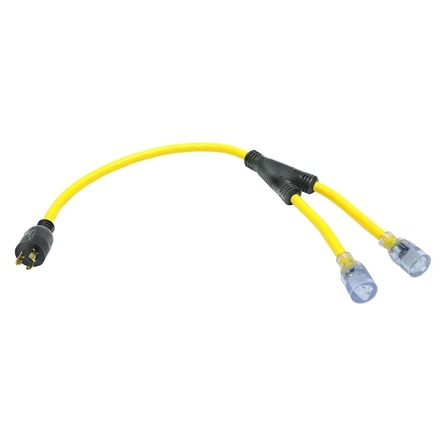 12″ Dogbone Power Adapter with Standard Grip (30A Locking Male x 20A Female x 20A Straight Female) (17361) by Arcon®. Arcon 110 Volt Pigtail Adapters adapt all brands of plugs. Made of durable PVC with solid brass contacts. The premium Pigtail Adapters feature a cord that is more visible and a unique handle. The handle makes plug extraction effortless and stores flat against the plug. The 110 Volt flat wire pigtail economy adapters have easy grip on both ends and are manufactured of flexible flat bonded 10/3 gauge wire.