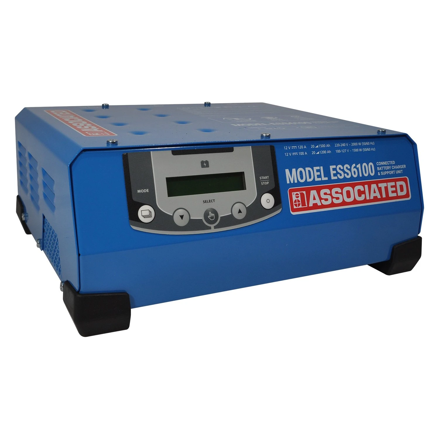 12 V Portable High Power Smart Battery Charger and Electrical Diagnostic Station with Tester by Associated Equipment®. 100% CONNECTED: Add. delete or modify charging modes and profiles via USB. Import predefined configuration files adapted to the load trades. Retrieve the charging history and data on a USB stick and use them on a spreadsheet. Connect additional modules (printer, barcode reader, etc.) via its dedicated module socket (SMC: Smart Module Connector). AUTOMATIC CHARGE: Extends the life and performance of Lead (gel. AGM. liquid, calcium, etc.) and Lithium (LFP) batteries. Specific charging curve in 8 steps (lead battery) or 9 steps (lithium-iron phosphate battery) without supervision. Recovers deeply discharged batteries >2 V (automatic SOS Recovery). ADVANCED FUNCTIONS: HI Flexible Voltage, the charger operates with a supply voltage between 100 and 127 V AC. -Auto-Detect- function automatically starts a charge when a battery is connected to the charger. «Auto-Restart- function in the event of a power failure with memory of the settings. Cable inspection and calibration Locking, avoids the risk of improper handling, ideal for garages and exhibition halls. Up to 12 charging profiles available, including the Easy profile for simplified charging suitable for all lead batteries. SAFETY: Protection of the vehicle’s on-board electronics: protection against short circuits, polarity reversal and overcharging. Spark prevention system. Interchangeable fusible which protect against misuse. Temperature sensor to prevent internal electronics overheating.