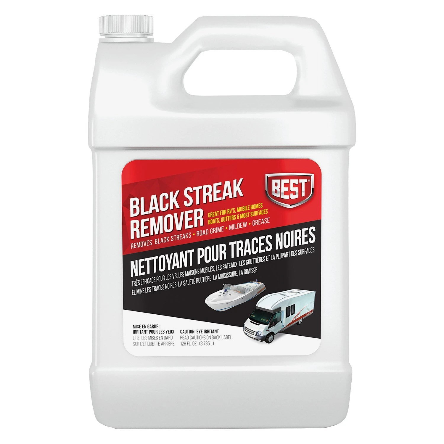 Black Streak Remover by B.E.S.T.®. Easily removes black streaks, tar and road grime build-up on any RV, with minimal rubbing. Also great for tires, white walls, wheels and gutters. Safe for use on fiberglass, metal and painted surfaces when used as directed. Won’t harm or fade decals.