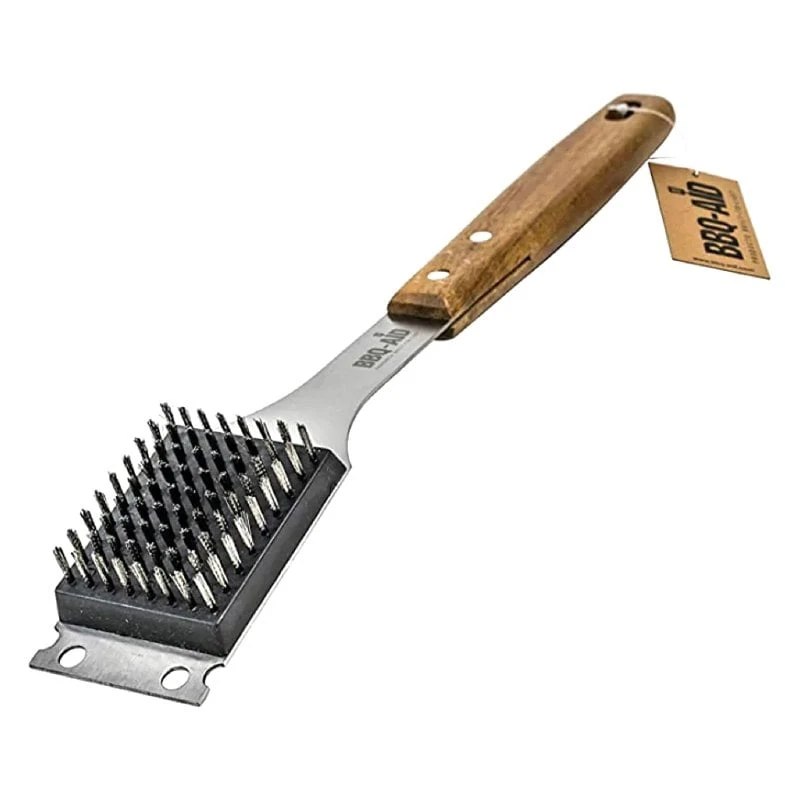 Grill Brush & Scraper (BBQCLEANINGBRUSHSTICKERLESS) by BBQ-AID®. 15″ ergonomic Acacia wood handle pairs with sleek stainless steel to create the strongest and most effective grill brush on the market. Enjoy easy to replace brush heads featuring extra strong bristles.