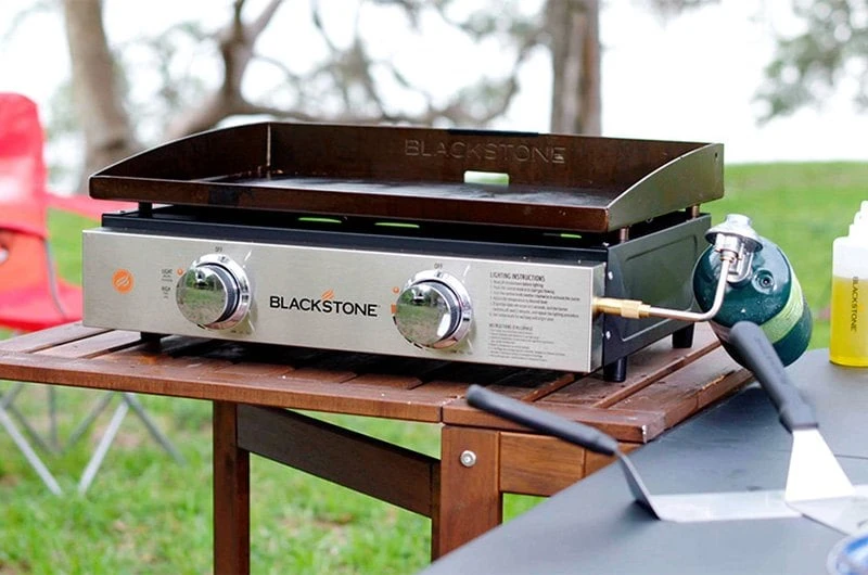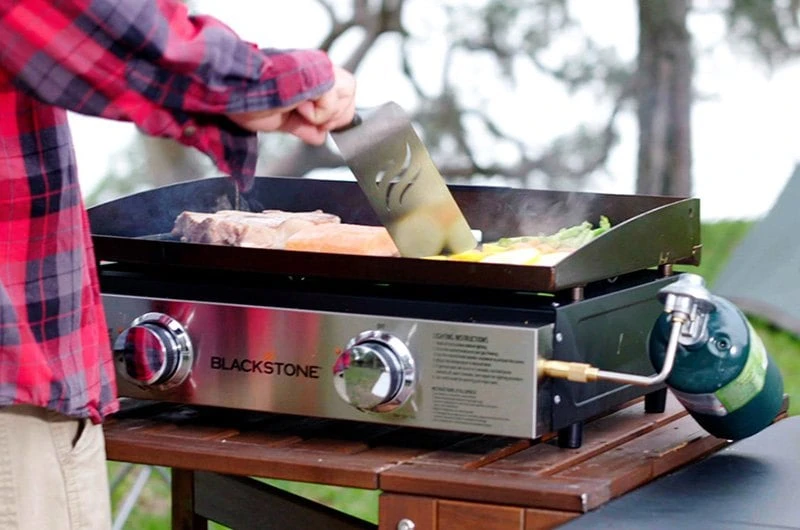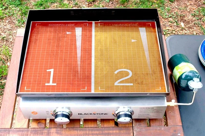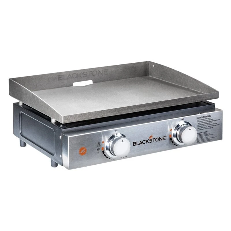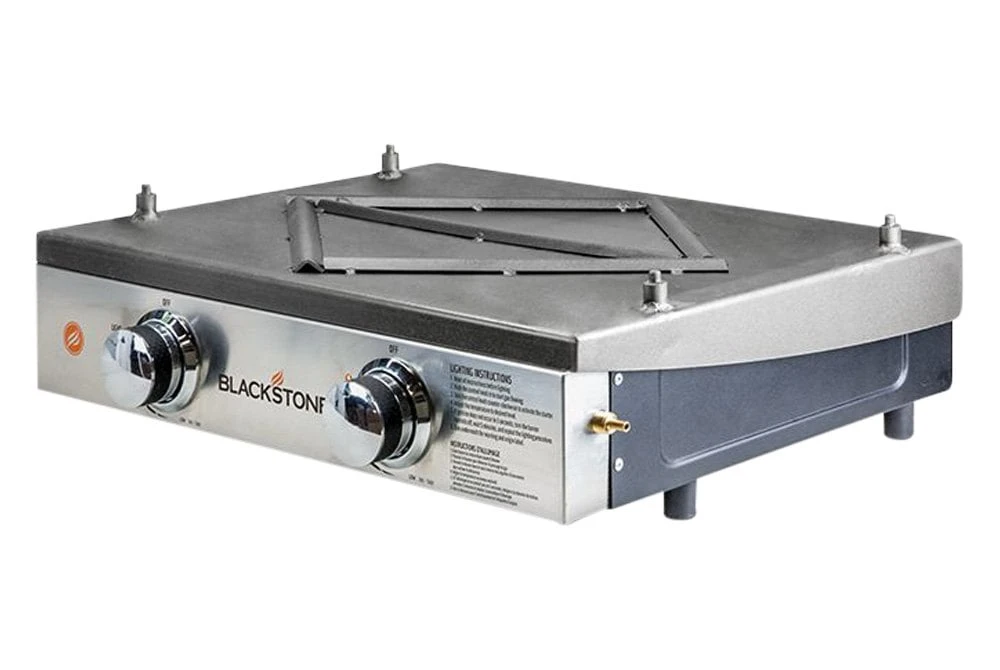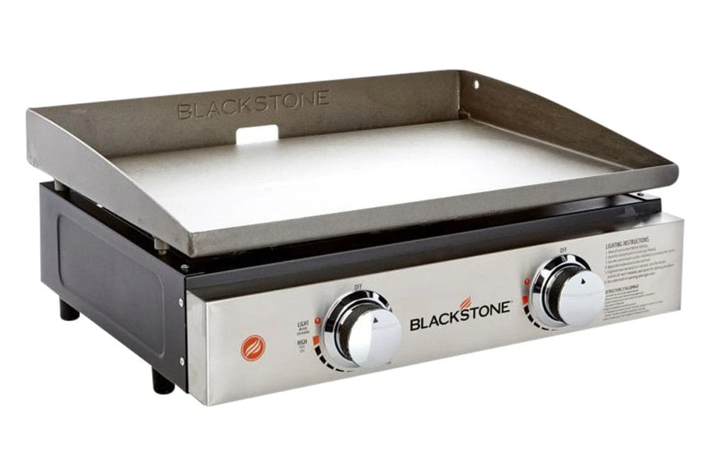22″ Tabletop Griddle by Blackstone®. Take the Blackstone 22” Gas Tabletop 2 Burner Griddle anywhere outdoors for big and versatile meals. Equipped with two independently controlled heat zones. You’ll have full control of the 352 sq. inch plate for simultaneous low and high heat cooking. The two “H” style burners provide even heat distribution for optimal cooking across the whole griddle. Stable on any surface from grassy hills to muddy terrain, so you can eat up delicious burgers, hot dogs, steaks, eggs, and more! No stress – easy to clean and feeds the whole family.