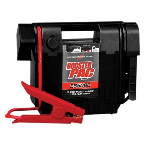 Universal 12v 1500 Peak Amps Portable Battery Jump Starter (ES5000) by Booster PAC®. Bring on the power! With a high performance battery and up to 1500 Peak Amps, the ES5000 is the Booster PAC for professionals who need serious starting power. Multiple jumps between charges and 43″ cables make the ES5000 as convenient as it is powerful.