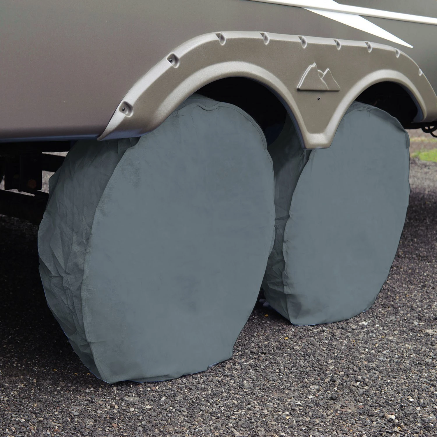 ProTECHtor™ Gray Single Axle RV Wheel Covers (Gray, 29″-31.75″Dia) by Budge®. Standard RV Wheel Covers are made from a water-resistant polypropylene material that is breathable and long-lasting.