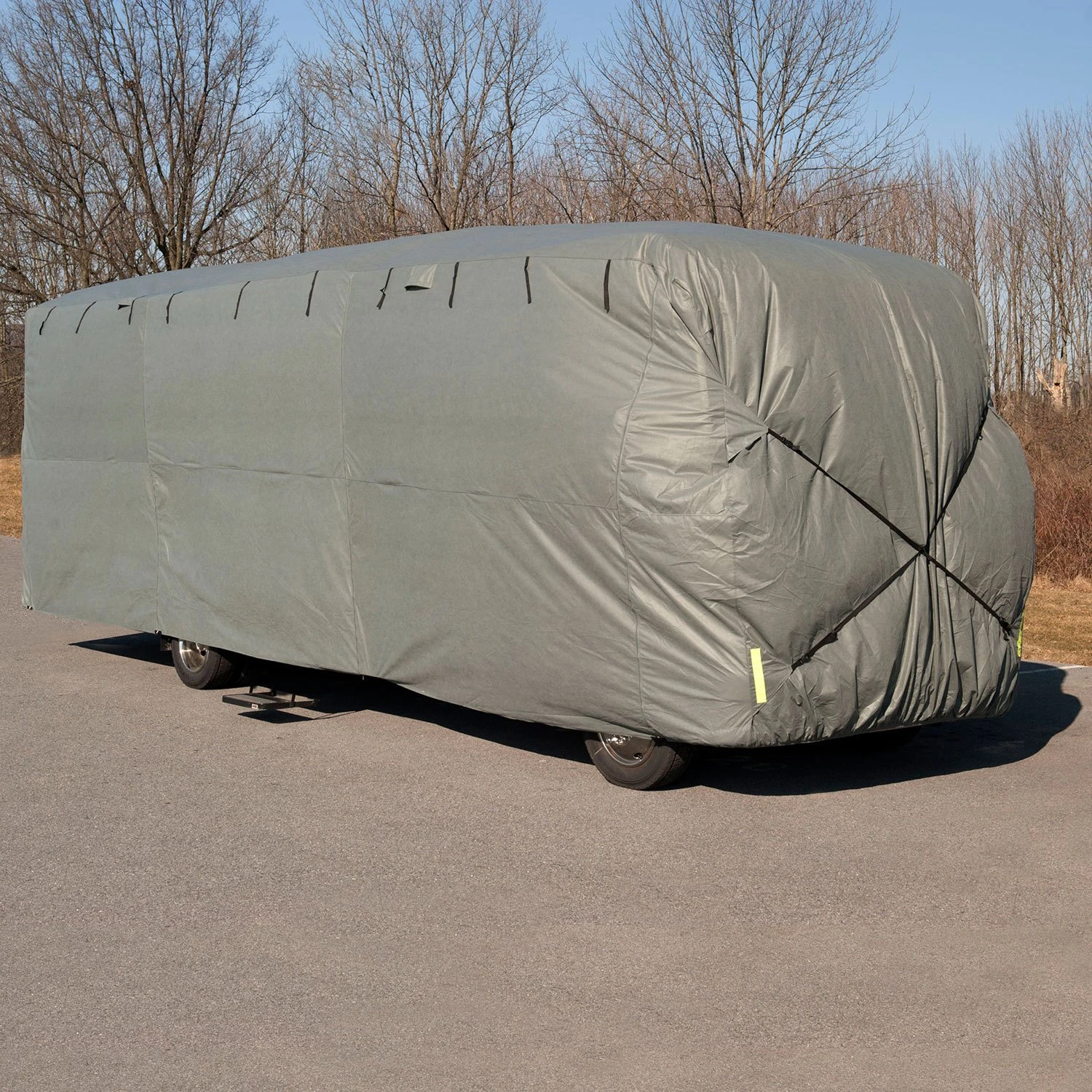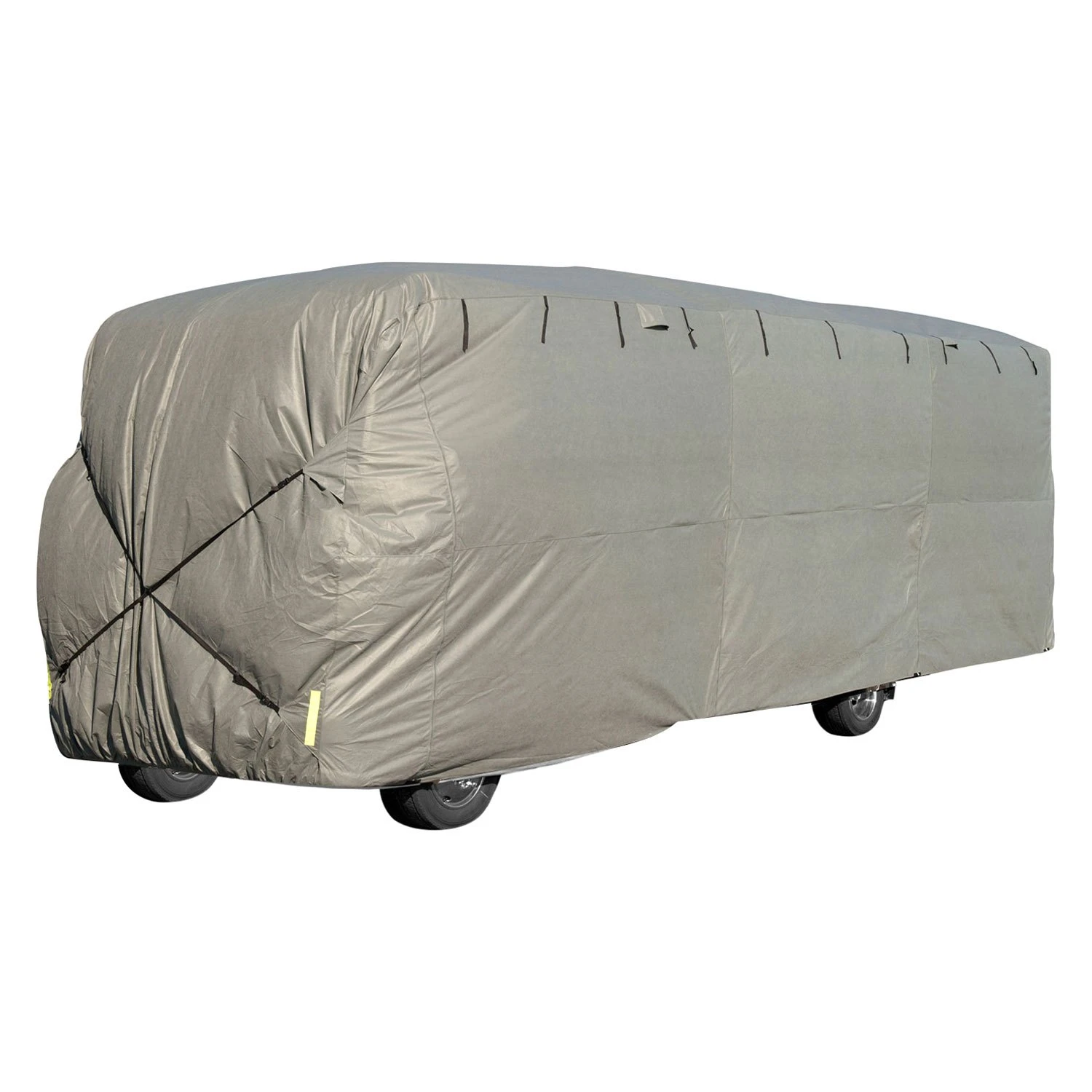 ProTECHtor™ Gray Class A Motorhome Cover (Gray, Up to 24′) (RVRB-1) by Budge®. Has a top panel that is made out of triple-layer water resistant material that will protect against sun, dirt and heavy dust. Single-layer side panels make the ProTECHtor cover light weight and easy to handle.