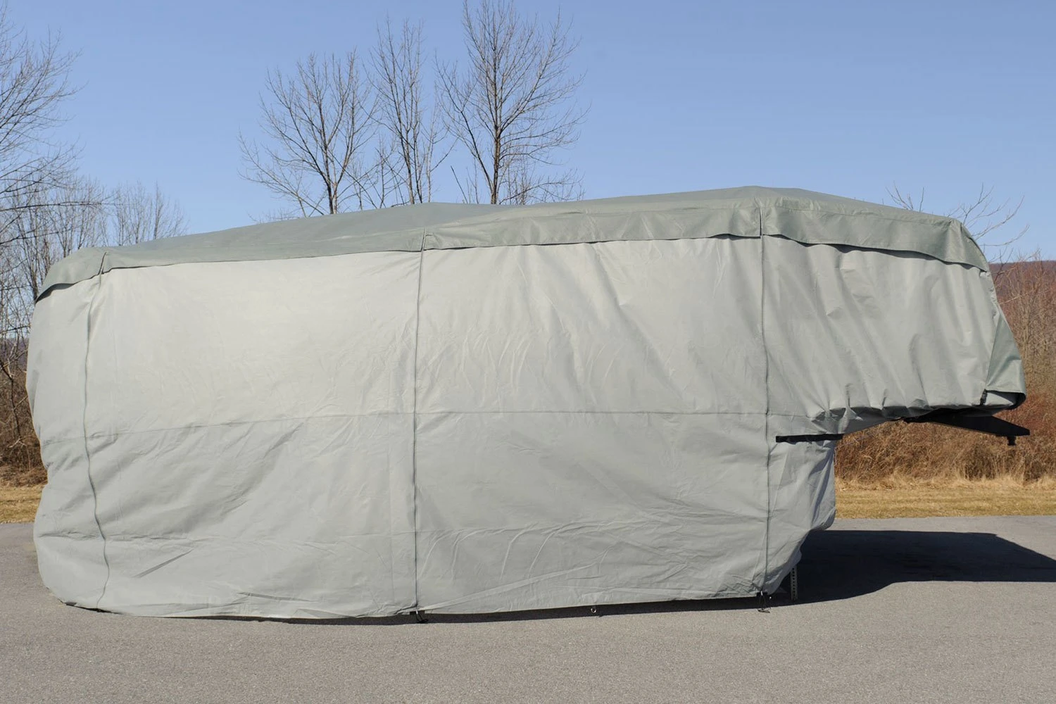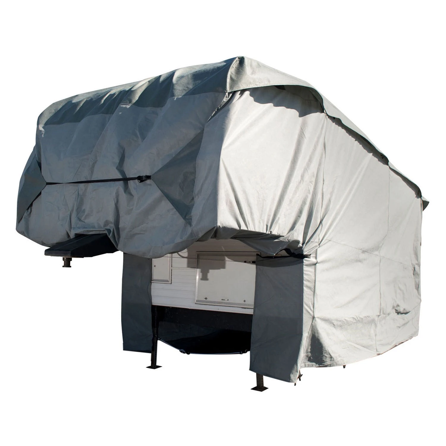 ProTECHtor Gray 5th Wheel Trailer Cover (Gray, Up to 29′) (RVRB-42) by Budge®. Cover has a top panel that is made out of triple-layer water resistant material that will protect against sun, dirt and heavy dust. Single-layer side panels make the ProTECHtor cover light weight and easy to handle.