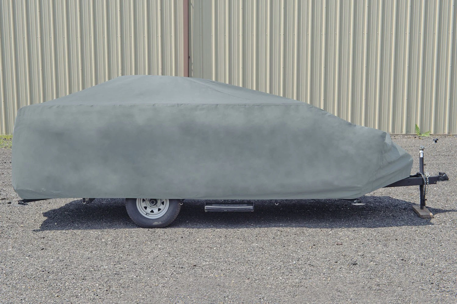 ProTECHtor™ Gray Pop-Up Trailer Cover (Gray, Up to 12′) (RVRB-61) by Budge®. Cover has a top panel that is made out of triple-layer water resistant material that will protect against sun, dirt and heavy dust. Single-layer side panels make the ProTECHtor cover light weight and easy to handle.