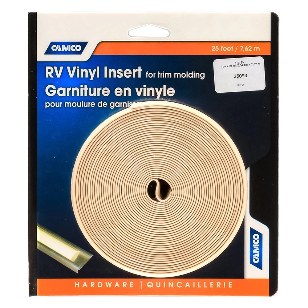 25′ Beige Vinyl Trim Insert (25093) by Camco®. Camco Vinyl Trim Insert is an easy-to-install replacement for cracked and stained trim inserts on aluminum roof edge, trim molding and truck camper shells. This Vinyl Trim Insert is made with UV inhibitors which provide a longer life.