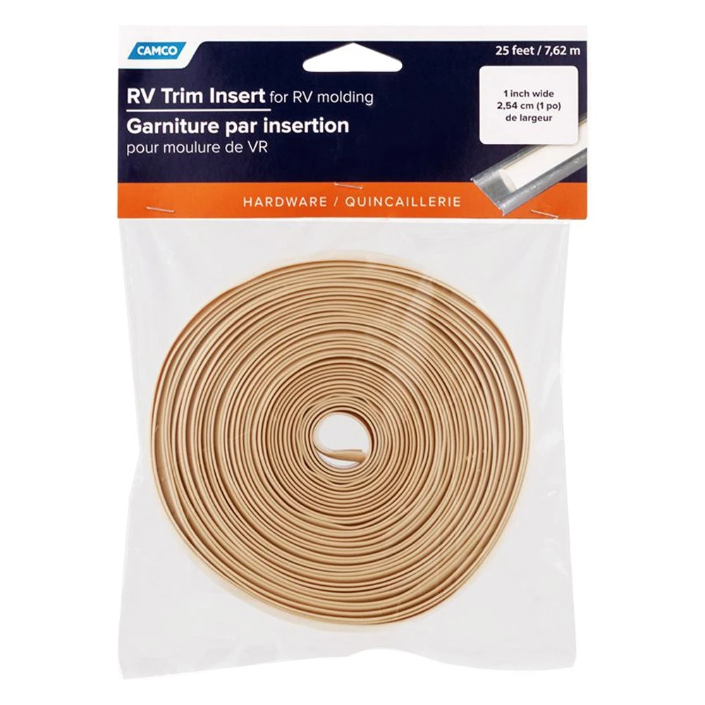 25′ Colonial White Vinyl Trim Insert (25123) by Camco®. Camco Vinyl Trim Insert is an easy-to-install replacement for cracked and stained trim inserts on aluminum roof edge, trim molding and truck camper shells. This Vinyl Trim Insert is made with UV inhibitors which provide a longer life.