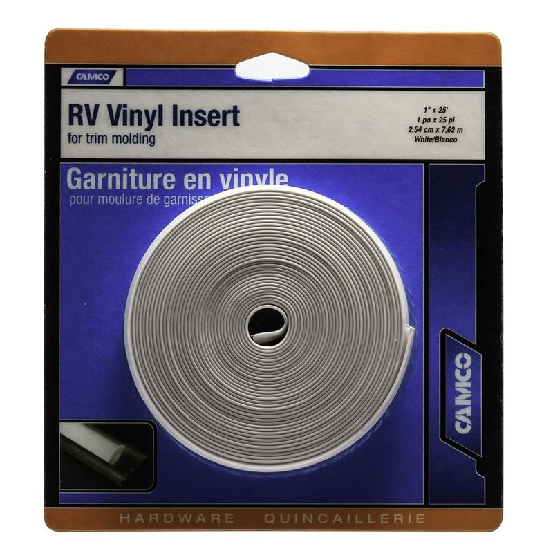 25′ White Vinyl Trim Insert (25163) by Camco®. Camco Vinyl Trim Insert is an easy-to-install replacement for cracked and stained trim inserts on aluminum roof edge, trim molding and truck camper shells. This Vinyl Trim Insert is made with UV inhibitors which provide a longer life.