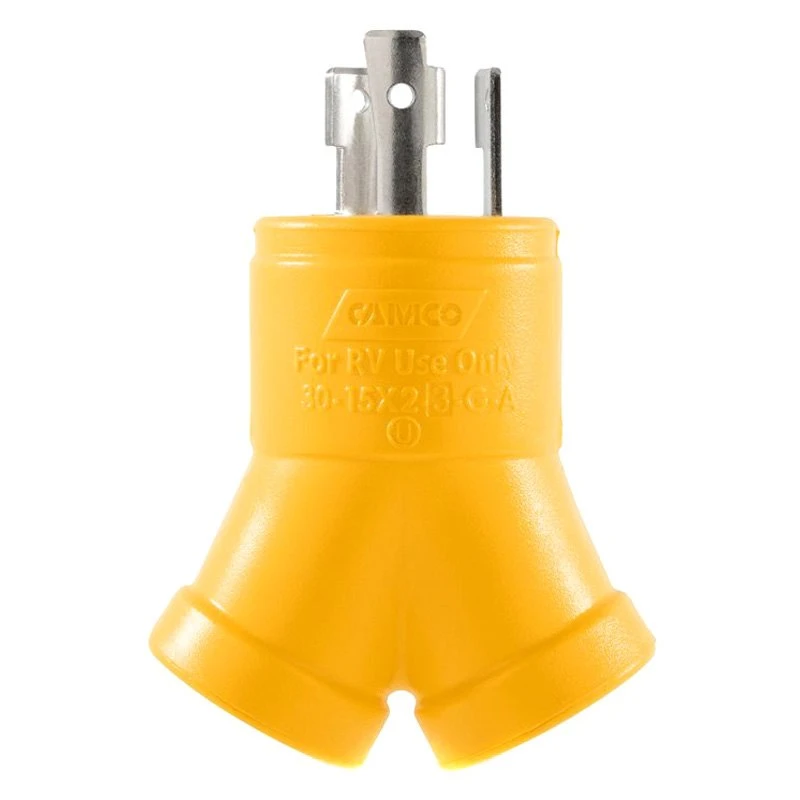 30A Male x 2 15A Female/125V/3750W 3-Prong Power Grip Y Generator Adapter by Camco®. Camco’s 3-Prong Generator Adapter allows you to easily and safely split one 30A receptacle into two 15A receptacles. This product is made of high-quality materials to serve you for years to come. Designed using state-of-the-art technology and with customers in mind. It will meet your needs and deliver great quality at an affordable cost.