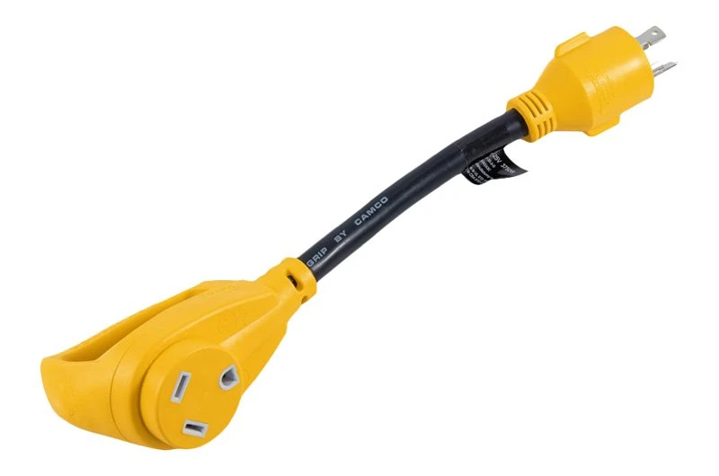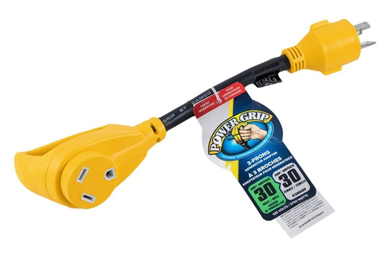 30A Male x 30A Female/125V/3750W 12″ 3-Prong Power Grip Dogbone Generator Adapter by Camco®. The Camco Heavy-Duty Generator Adapter with PowerGrip Handle, L5-30-Amp Locking 3-Prong Male to TT-30 30-Amp Standard Female, 12″, 10/3-Gauge Wires (125 V/3750 W) is designed to connect a generator with a NEMA L5-30 locking receptacle to an RV that uses a standard RV cord set (NEMA TT-30). The cord is coated with a heavy-duty flame retardant, heat-resistant PVC sheath that serves as protection from the outdoor elements, wear and tear. A hassle-free PowerGrip head helps assist in gripping, plugging and unplugging without straining or damaging the generator adapter. It features heavy-duty 30-amp locking male (NEMA L5-30) and 30-amp standard female (NEMA TT-30) ends. Rated for 125 volts/3750 watts and constructed with 100% copper, 10/3-gauge wires for superior conductivity. This product is internationally certified for use in both the U.S. and Canada.