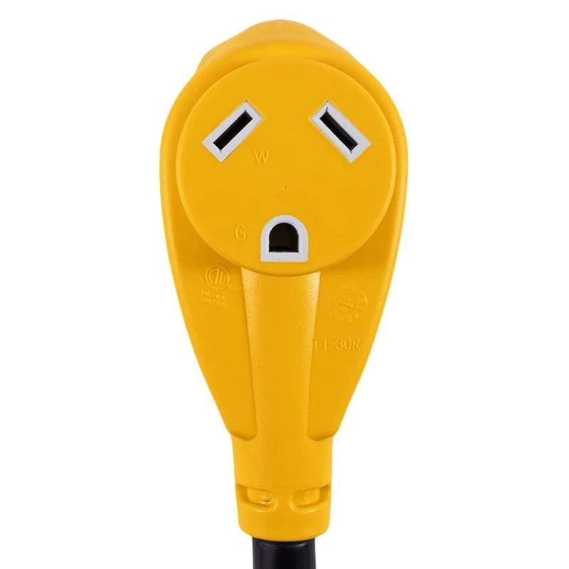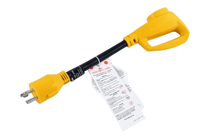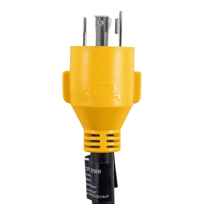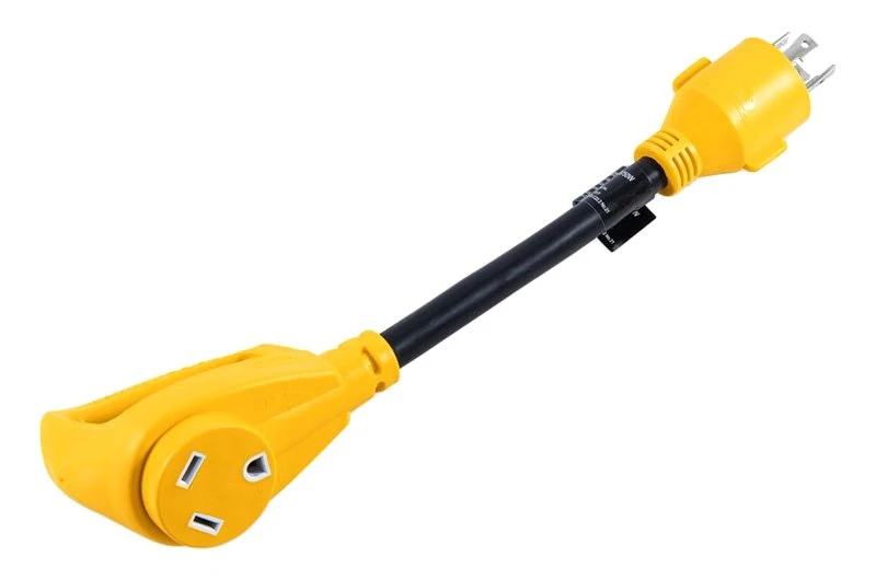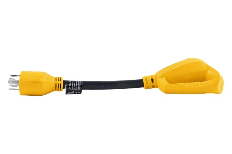 30A Male x 30A Female/125V/3750W 12″ 4-Prong Power Grip Dogbone Generator Adapter by Camco®. Camco RV 12″ 30M/30F PowerGrip Generator Adapter is a 4-prong adapter for use with Recreational Vehicles. Designed to connect a generator with a L14-30 locking receptacle to an RV that uses a standard RV cord set (TT-30) to connect to 120V AC shore power. It features a patented PowerGrip handle to help make unplugging easier and is rated for 125V/3750W. It is also CSA certified.