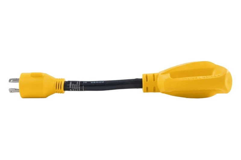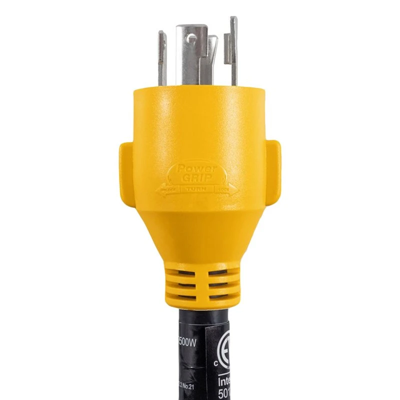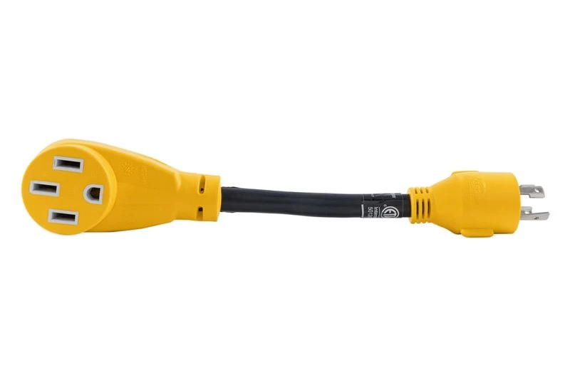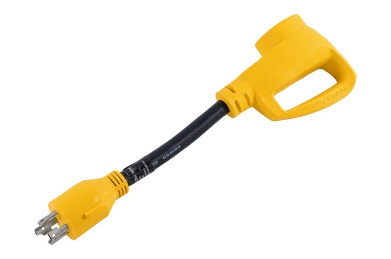 30A Male x 50A Female/125-250V/7000W 12″ 4-Prong Power Grip Dogbone Generator Adapter by Camco®. Camco’s 12″ RV PowerGrip Generator Adapter connects a generator with a L14-30 locking plug receptacle to a recreational vehicle that uses a standard 50 AMP RV cord set. It features the patented PowerGrip handle for ease of use and is rated for 7500 Watts, 125/250V. The adapter’s male end is a four prong L14-30 and female end is standard 50 AMP.