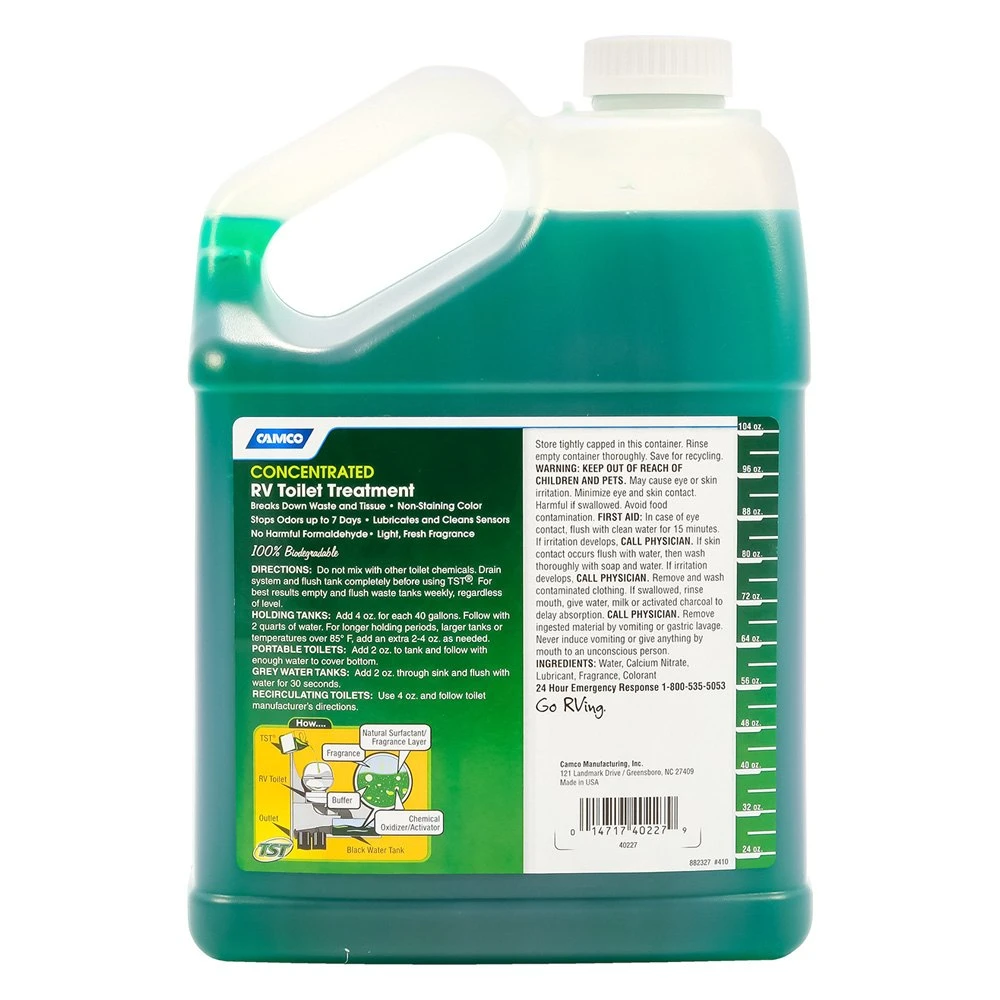 TST™ 128 oz. Fresh Toilet Treatment (1 Piece) (40227) by Camco®. Original formula takes only 4 ounces to treat an entire 40-gallon tank in any season. Also available in an easy-to-use bottle with a convenient built-in reservoir for measuring. Eliminates odors and lubricates sensors. Safe for all septic tanks.