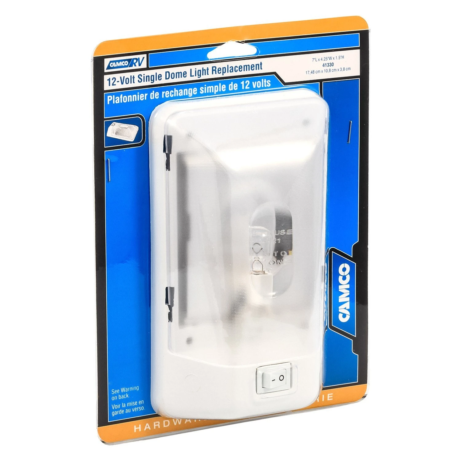 Rectangular Surface Mount Incandescent Single Bulb Overhead Light with Switch (7.0″L x 4.5″W x 1.3″D) (41330) by Camco®. This RV Replacement single dome light. Measures 7″ L x 4.25″ W x 1.25″ H. 12V bulb design includes instructions and bulbs. These dome lights are very durable, highly effective and easy to use.