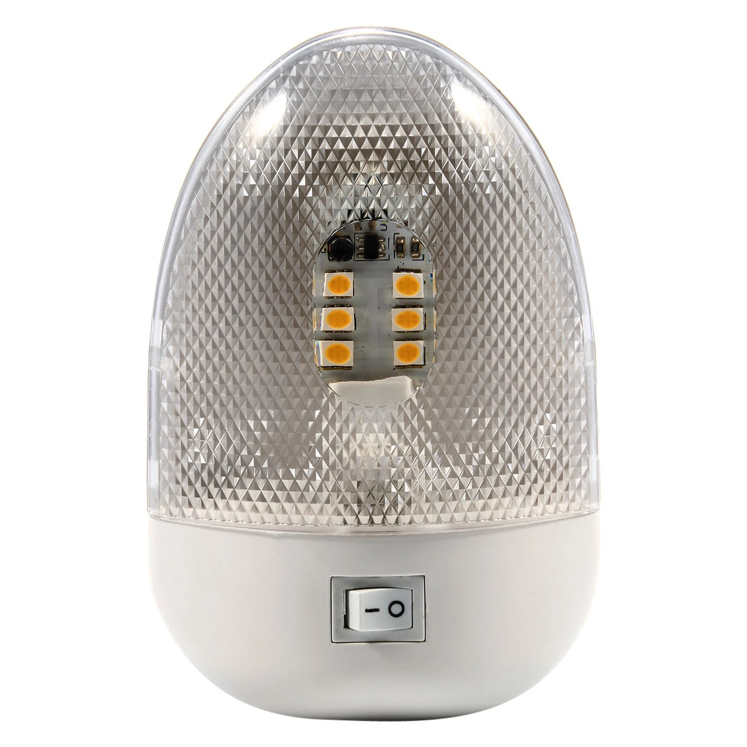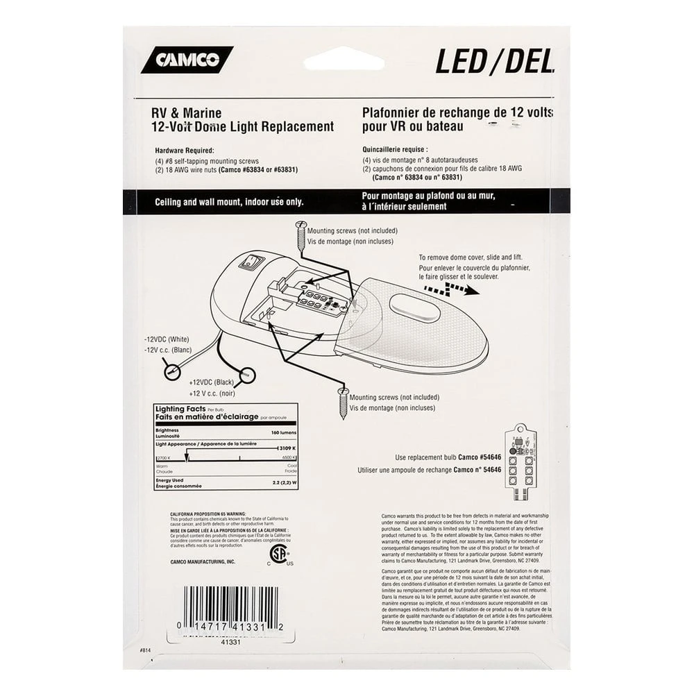 Oblong 160 lm Surface Mount LED Single Bulb Overhead Light with Switch (7.0″L x 2.0″W x 1.3″D) (41331) by Camco®. 1 Piece. The LED Single Dome Light Replacement Kit is 160 lumens and 12 Volts. Great for replacing the dome light in your marine or recreational vehicle. Light is a warm white.