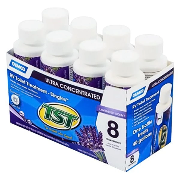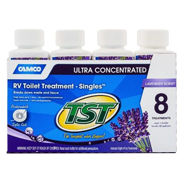 Singles™ 4 oz. Lavender Toilet Treatment (8 Pieces) (41551) by Camco®. The TST Lavender Holding Tank Treatment helps control unwanted odors and keep sensors lubricated in your black water holding tank. The easy to use liquid contains a blend of lavender-scented surfactant oils that trap unwanted odors in your tank, making your camping experience more enjoyable. TST Lavender is RV and marine approved, non-formaldehyde and safe for all septic tanks – it’s even great for portable camping toilets!