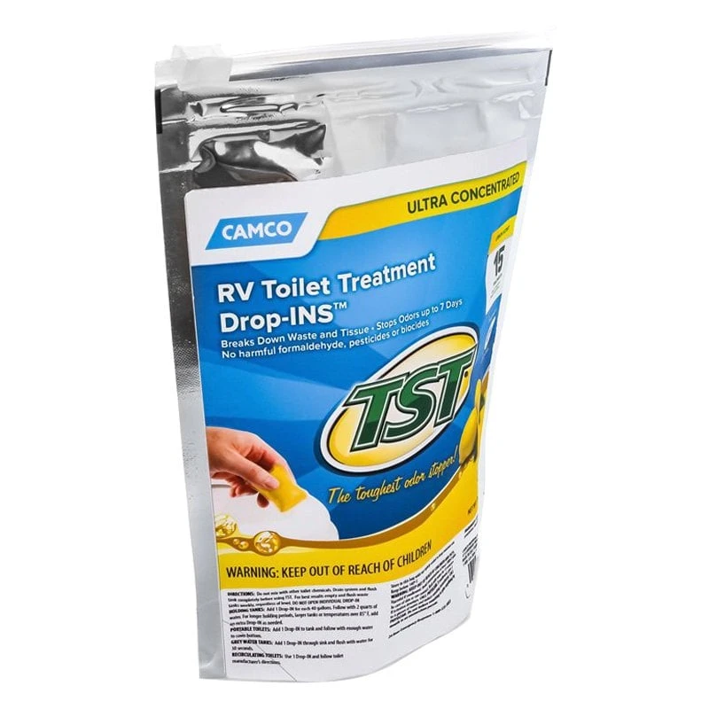 TST Drop-Ins™ 1.7 oz. Lemon Toilet Treatment (15 Pieces) (41570) by Camco®. The TST Lemon Drop-Ins help control unwanted odors and break down waste and tissue in your black water holding tank. The easy to use drop-ins contain a special chemical that helps break down waste, and a blend of lemon-scented surfactant oils that trap unwanted odors in your tank, making your camping experience more enjoyable. The drop-ins are RV and marine approved, non-formaldehyde and safe for all septic tanks – they’re even great for portable camping toilets! Each container comes with 15 drop-ins.