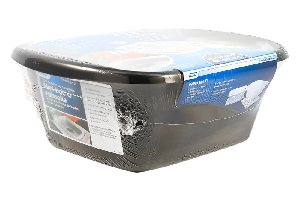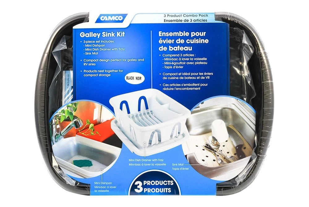White Plastic Galley Sink Kit (43518) by Camco®. The Camco Sink Kit makes doing dishes in your RV a breeze. The dish drainer can hold full sized plates, cups and utensils for up to six people. The sloped tray helps excess water run off into your sink and doubles as a lid. The dish pan and sink mat all nest together with the dish drainer for compact storage. Perfect for galley sinks and limited counter space.