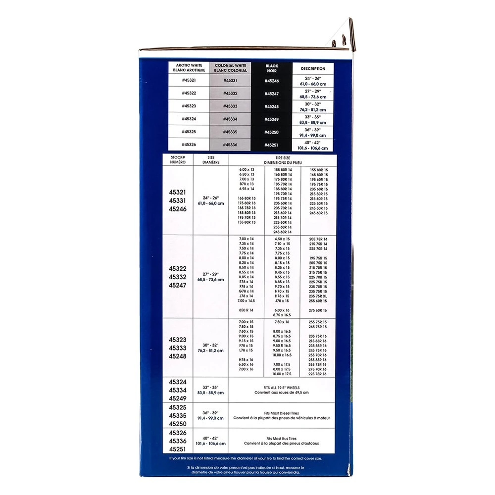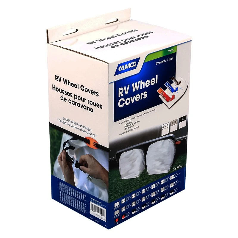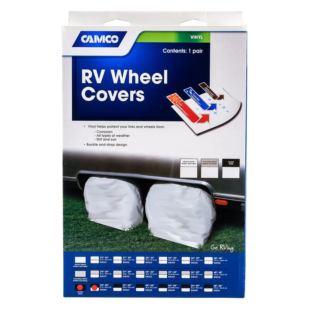 Black Single Axle RV Wheel Covers (Black, 24″-26″Dia) (45246) by Camco®. Vinyl covers protect your tires and wheels from sun, dirt, corrosion and all types of weather while your vehicle is parked.