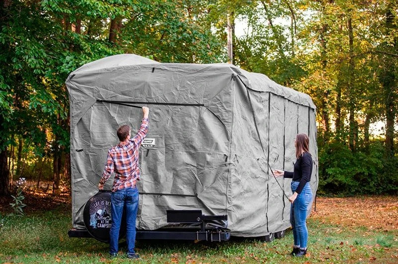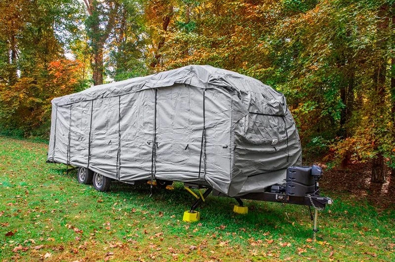 UltraGuard™ Gray Class C Motorhome Cover (Gray, Up to 26′) (45742) by Camco®. Shield your investment with Camco’s ULTRAGuard RV Cover. Triple layer SFS top panel beads water on contact affording maximum resistance to rainfall and snow. Heavy duty polypropylene fabric around sides. Vented design resists mold and mildew growth. Vent flaps reduce wind lofting and inside moisture. Tough interlocking seams. Integrated self-adjusting hold down system.