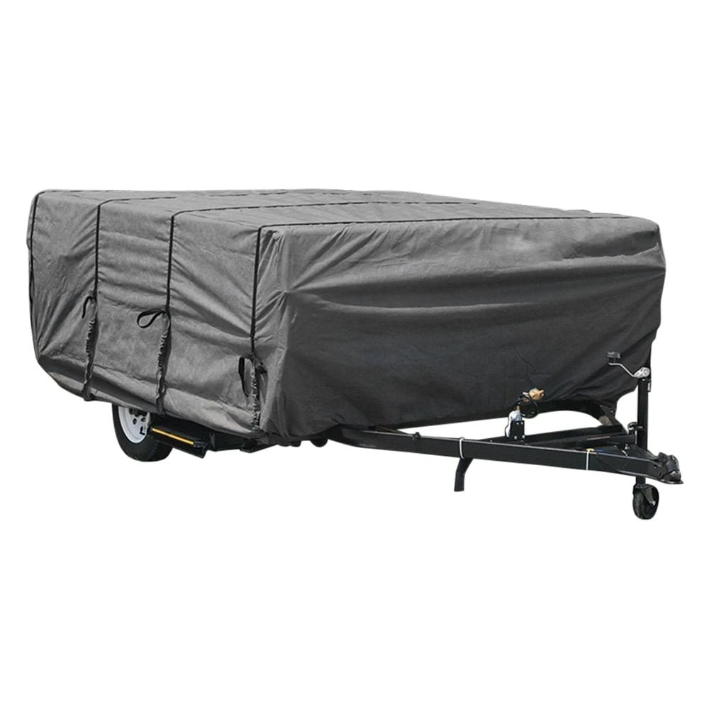 UltraGuard™ Gray Pop-Up Trailer Cover (Gray, Up to 8′) (45760) by Camco®. Protect your RV during storage. Triple layer SFS top panel beads water on contact affording maximum resistance to rainfall and snow. Heavy duty Polypropylene fabric around sides. Vented design resists mold and mildew growth. Vent flaps reduce wind lofting and inside moisture. Tough interlocking seams. Integrated self-adjusting hold down system.