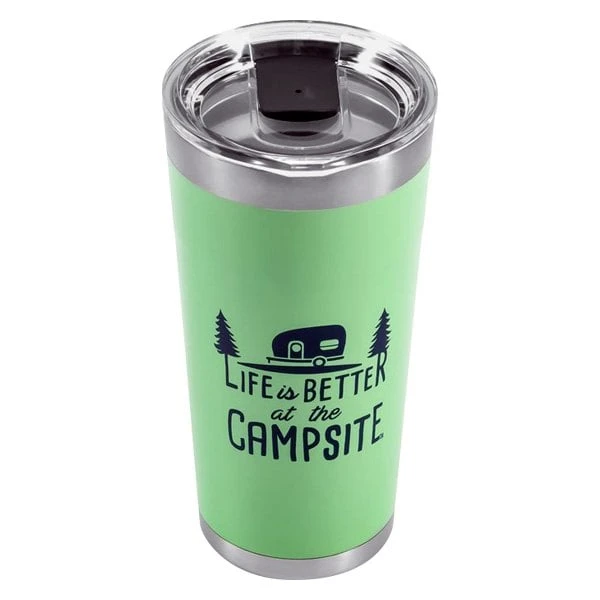 “Life is Better at the Campsite” 20 oz. Green Stainless Steel Thermo Tumbler with “Life is Better at the Campsite” Logo (53063) by Camco®. Offer superior heat and ice retention. They are constructed of durable, kitchen-grade 18/8 stainless steel and come with a BPA free lid. The double wall vacuum insulation and built-in gasket help prevent heat transfer, meaning your ice stays solid longer and your cup won’t sweat.