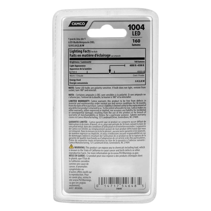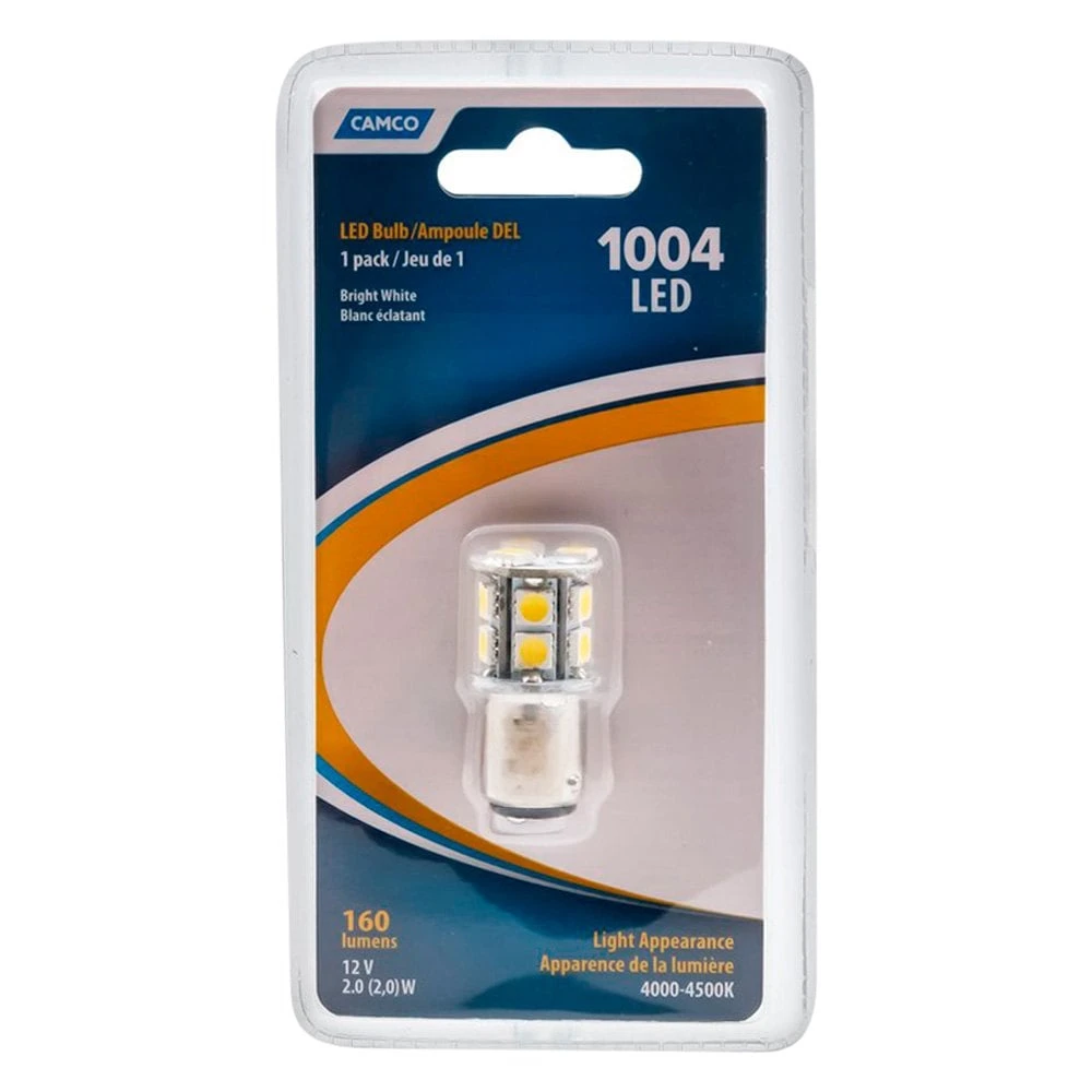 BA15D Base 160 lm Bright White LED Bulb (54648) by Camco®. 1 Piece. This LED Replacement Bulb replaces 1004 (BA15D) style light bulbs. It has 13 individual lights for a measured 160 lumens. 12V, bright white light, contains 1 bulb.