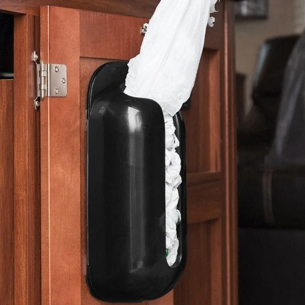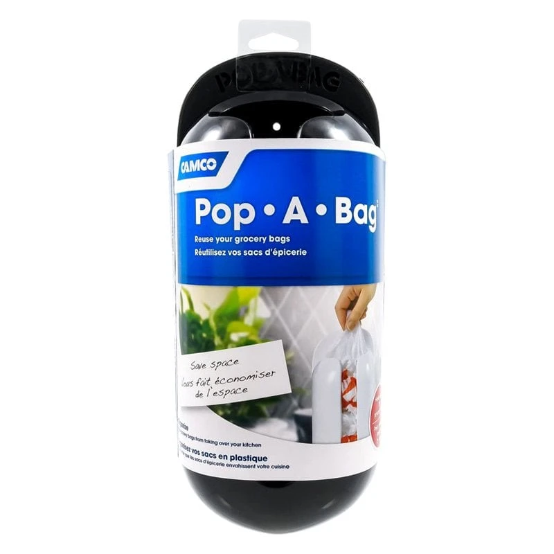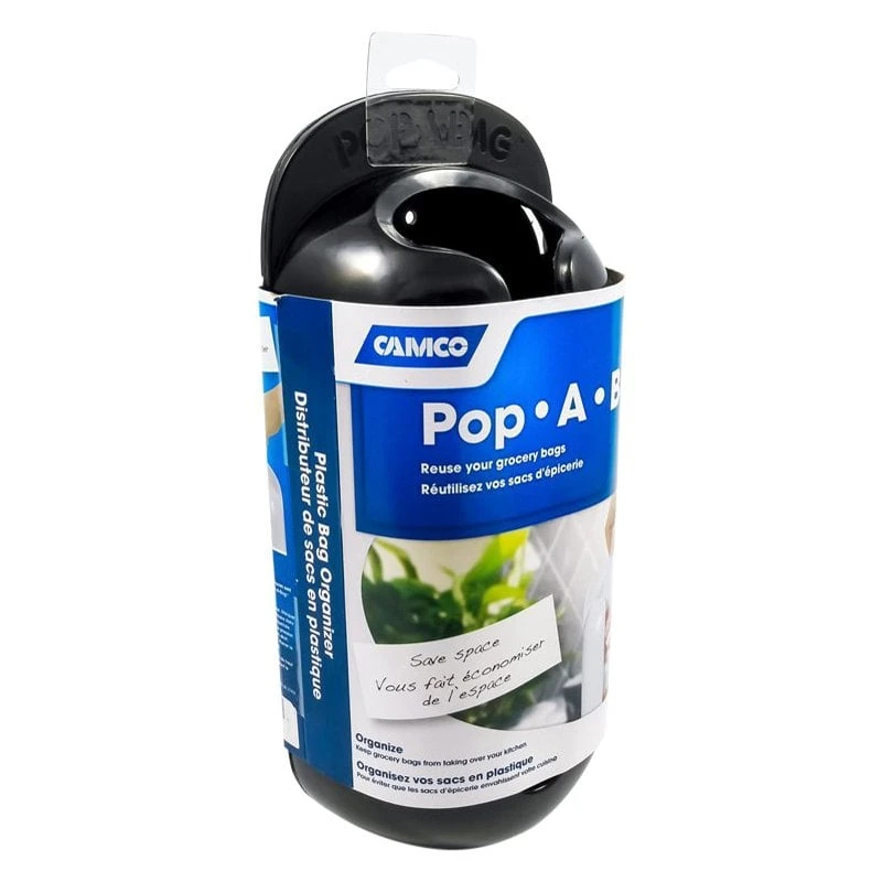 Pop-A-Bag™ Black Plastic Bag Organizer (57065) by Camco®. Designed to store plastic grocery bags, trash bags and dryer sheets efficiently. It has a plastic bag holder and dispenser that mounts easily on walls, inside the cabinets with screws or double-sided tape. Unit can hold up to 25 plastic grocery bags and is patented.