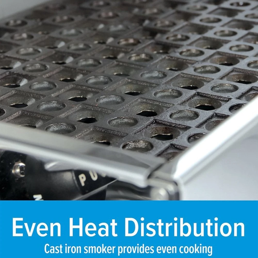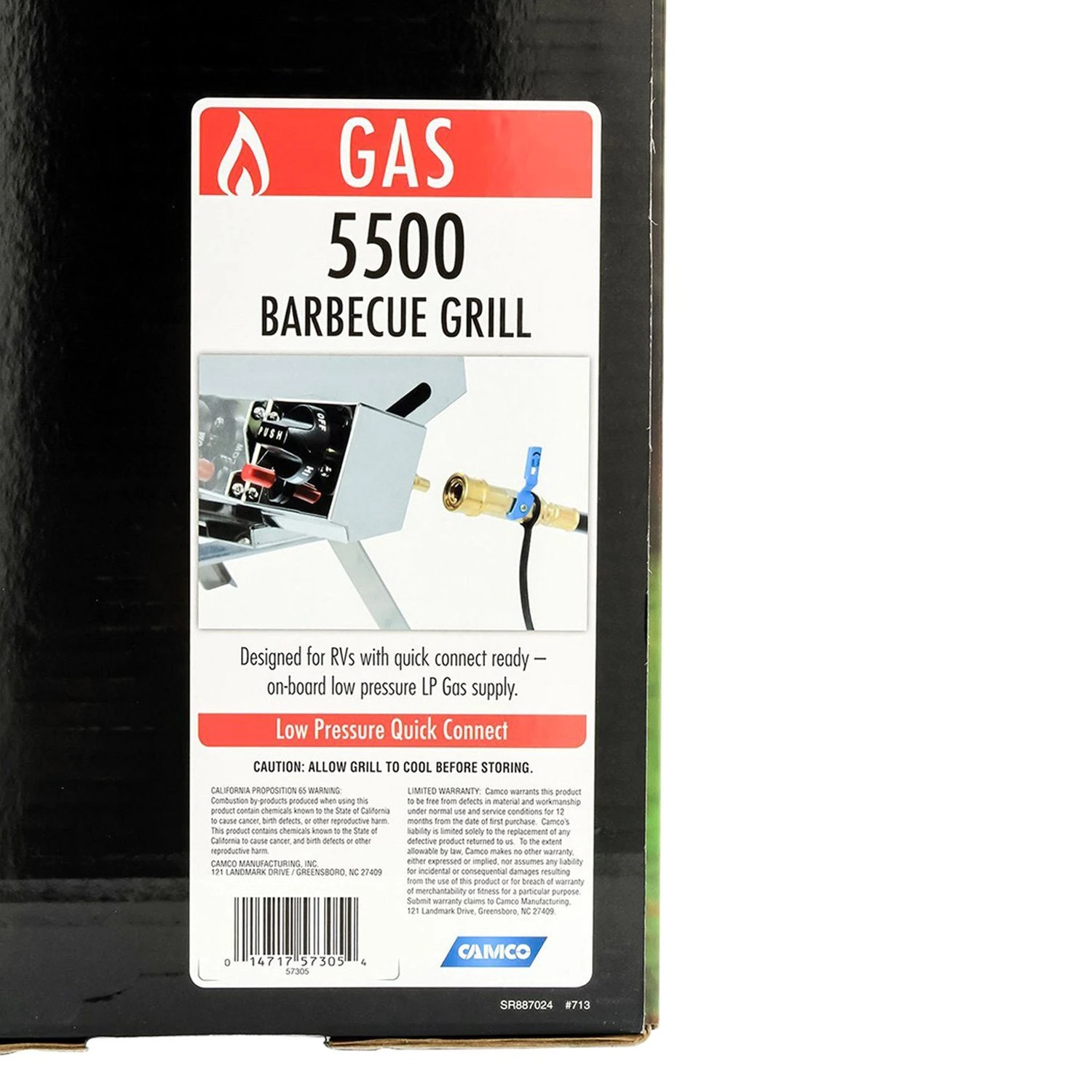 Olympian 5500 Portable Gas Grill (57305) by Camco®. Is designed for RV and outdoor use and is easy to transport. This high quality lightweight 304 stainless-steel barbecue has a large cooking area of 180 sq in. Its cast iron smoker plate is designed to offer the fullest flavor while minimizing grease fires. The stainless-steel burner heats up faster, is easier to clean, and resists rust. The grill is ready to use straight from the box, only assembly required is the mount to hang the grill on the RV mounting rail. It includes a quick-connect hose and valve to use the low-pressure propane supply on an RV or trailer that has a built-in low pressure quick-connect propane connection. The Camco Quick-Connect x ACME Propane Hose (57629) or Quick-Connect x Throwaway Propane Hose (57628) must be purchased separately to use the grill with a 20 lb propane cylinder or 1 lb throwaway propane cylinder. Weighs approximately 26 lb.