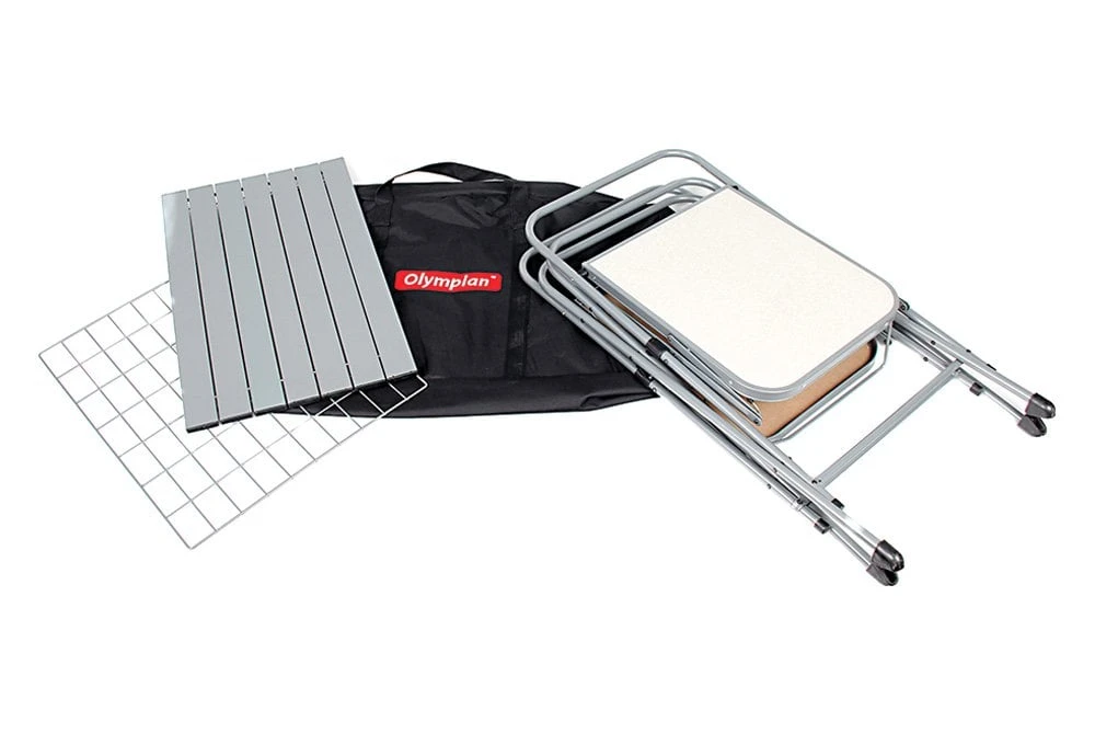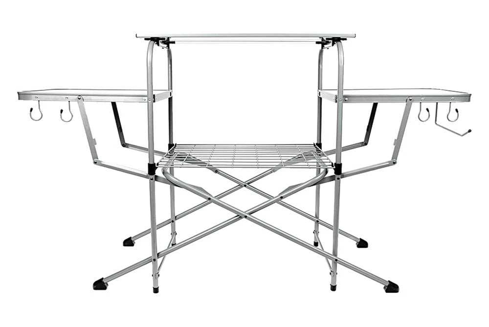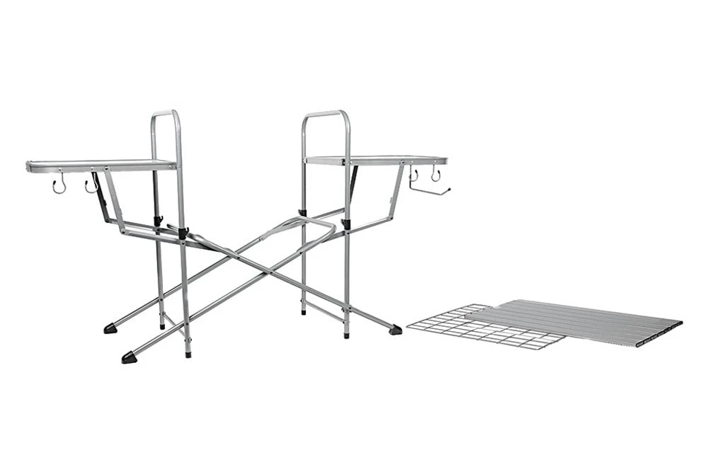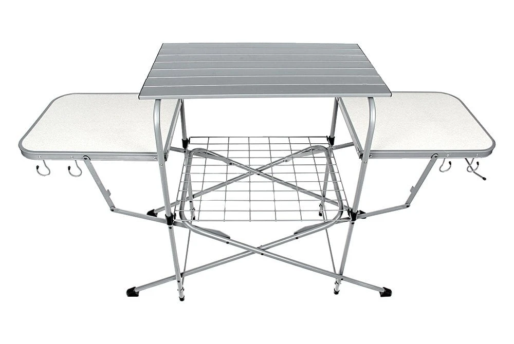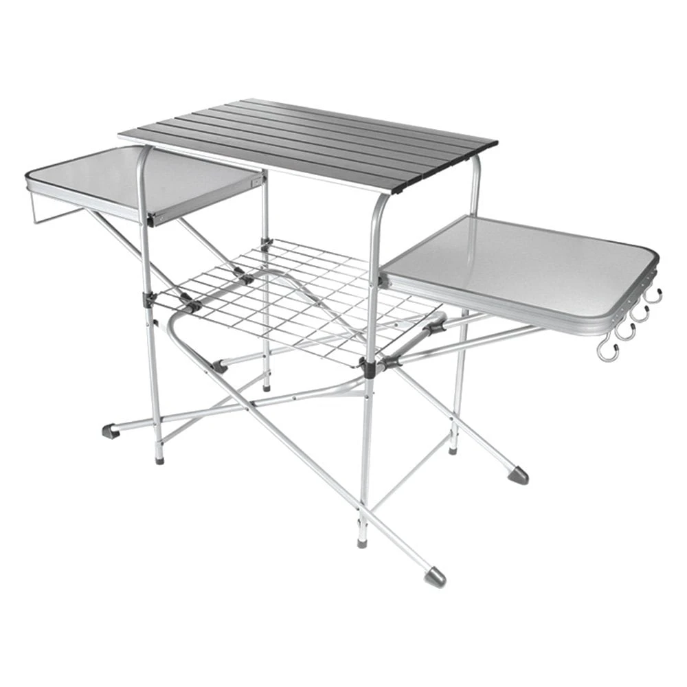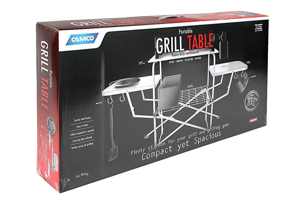 Deluxe Gray Folding Grill Table by Camco®. Spacious grill table has a lightweight, high strength steel frame and an aluminum table top. Table is quick and easy to set-up. Great for picnics, camping, sporting events and backyards.