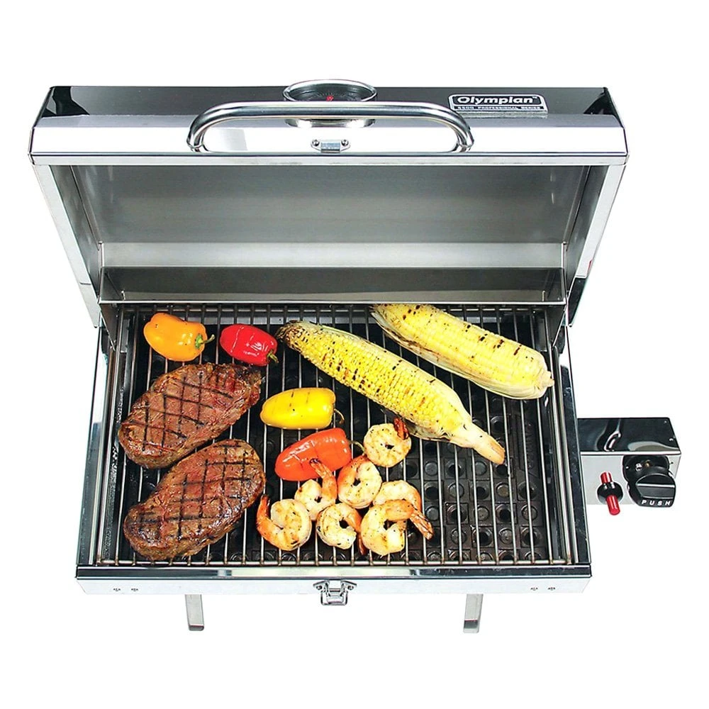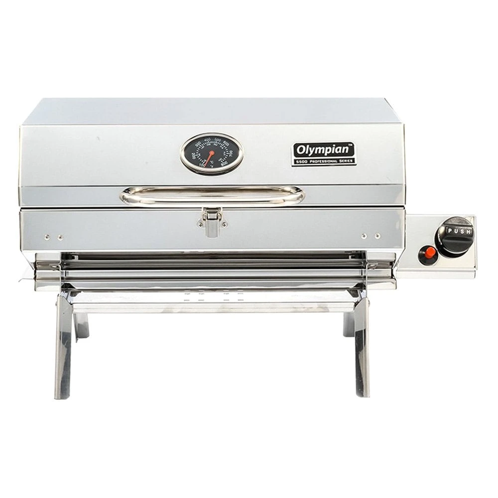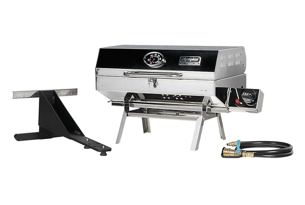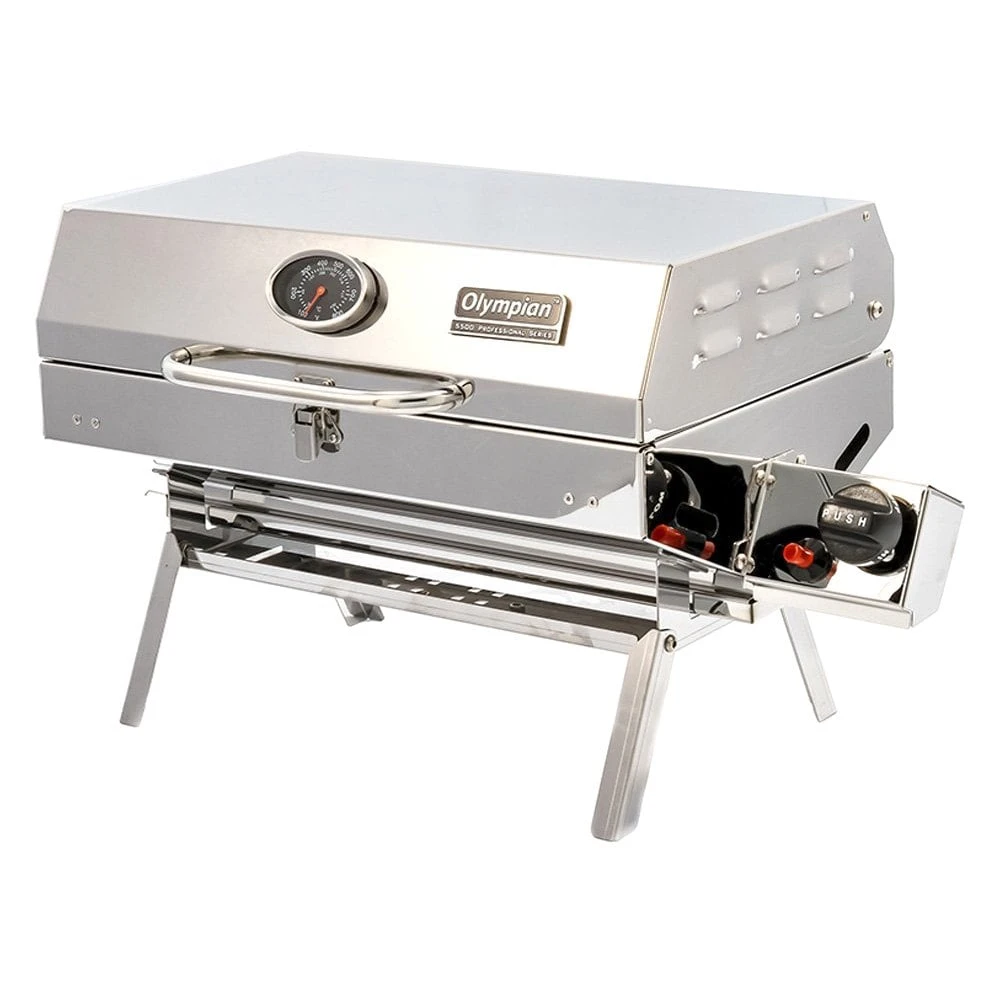 Olympian 5500 Portable Gas Grill by Camco®. Is designed for RV and outdoor use and is easy to transport. This high quality lightweight 304 stainless-steel barbecue has a large cooking area of 180 sq in. Its cast iron smoker plate is designed to offer the fullest flavor while minimizing grease fires. The stainless-steel burner heats up faster, is easier to clean, and resists rust. The grill is ready to use straight from the box, only assembly required is the mount to hang the grill on the RV mounting rail. It includes a quick-connect hose and valve to use the low-pressure propane supply on an RV or trailer that has a built-in low pressure quick-connect propane connection. The Camco Quick-Connect x ACME Propane Hose (57629) or Quick-Connect x Throwaway Propane Hose (57628) must be purchased separately to use the grill with a 20 lb propane cylinder or 1 lb throwaway propane cylinder. Weighs approximately 26 lb.