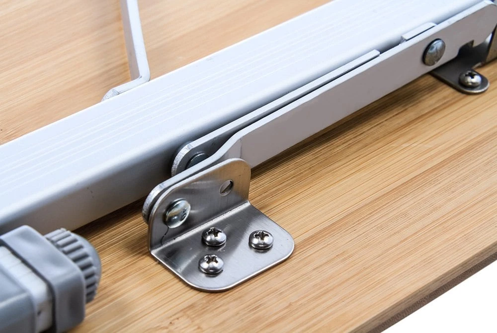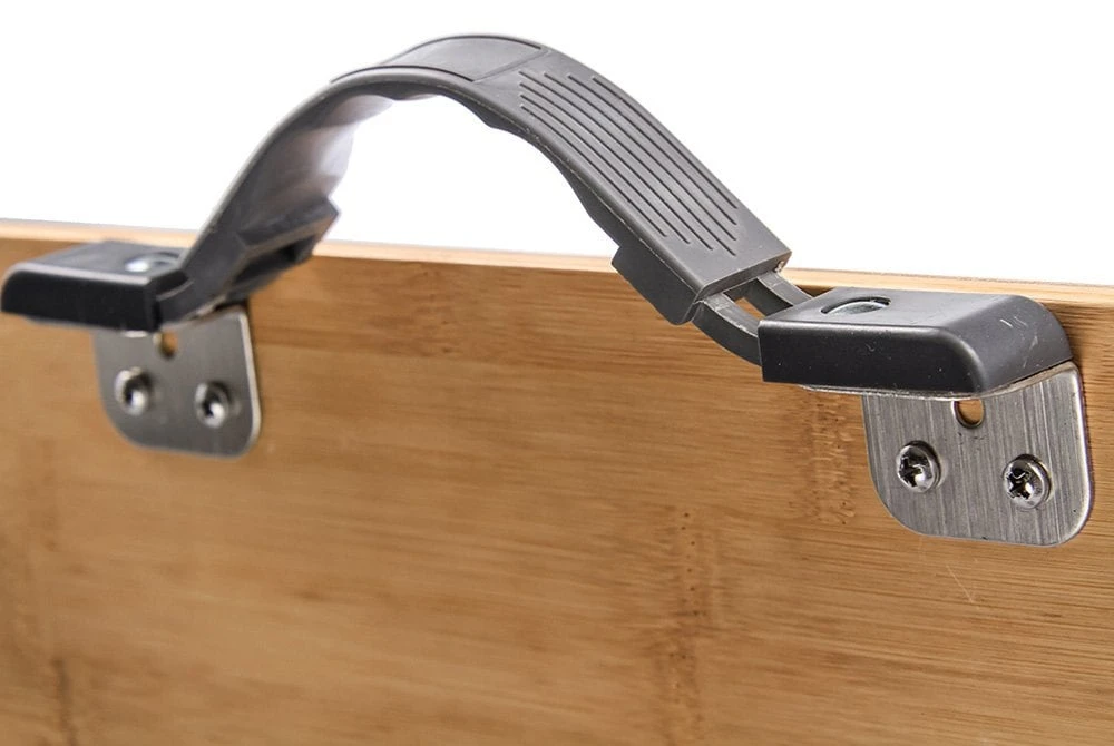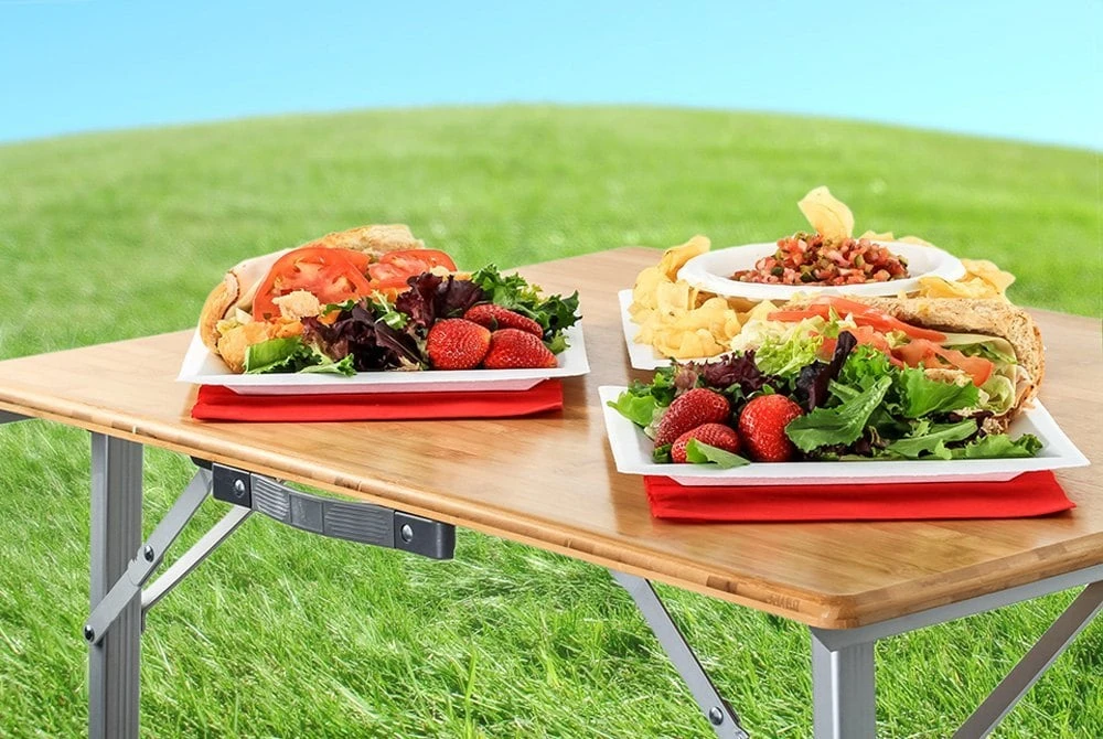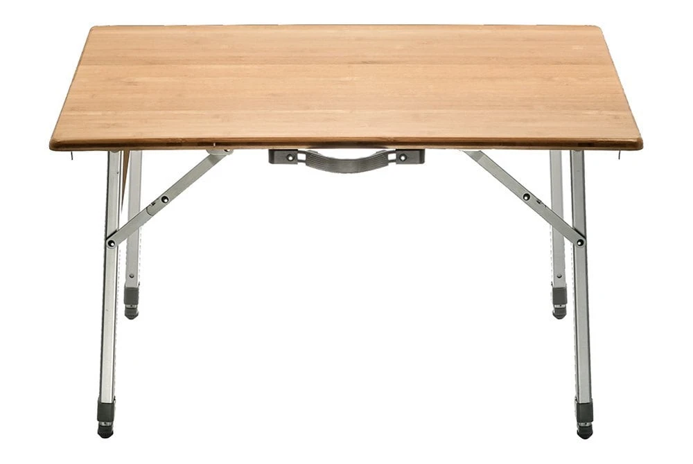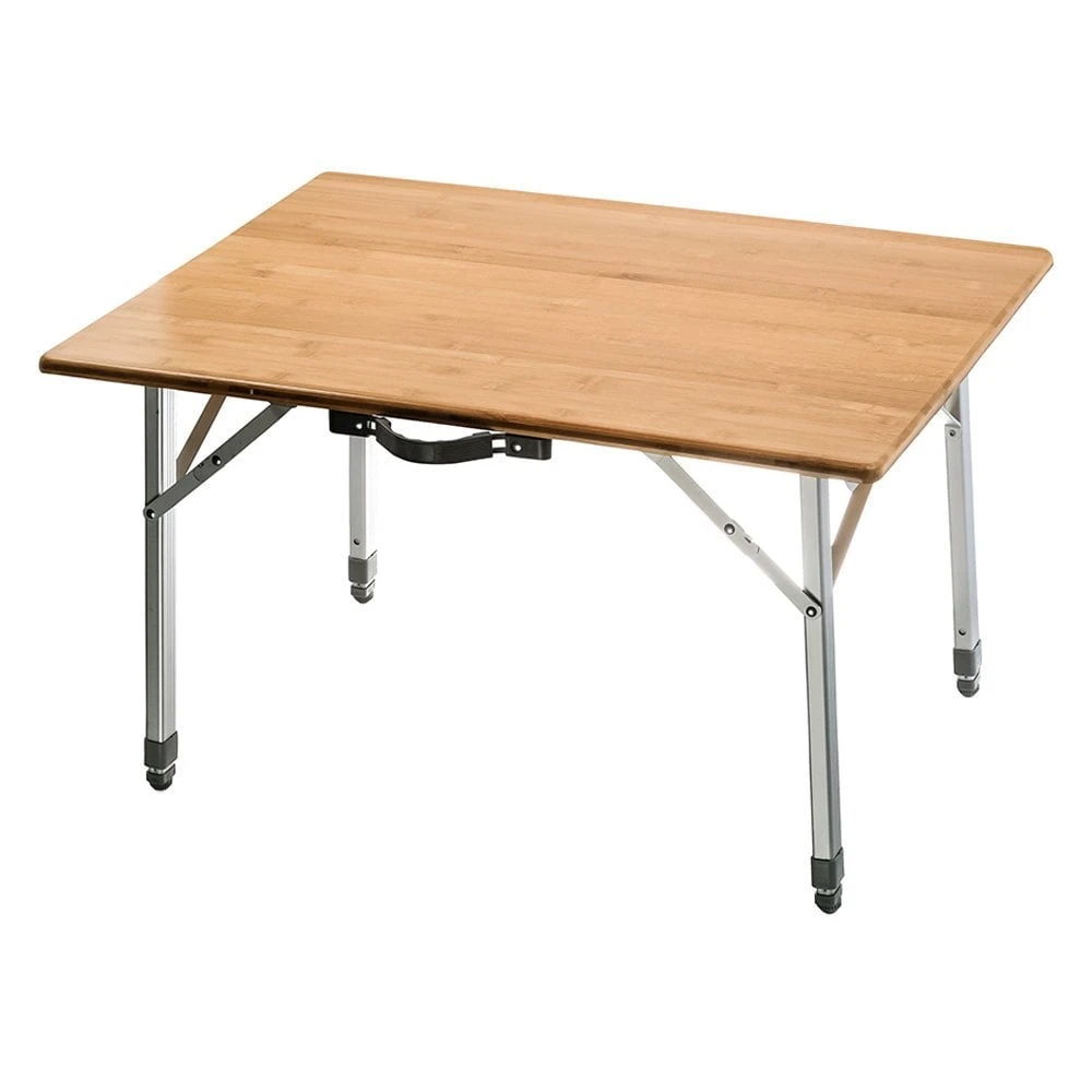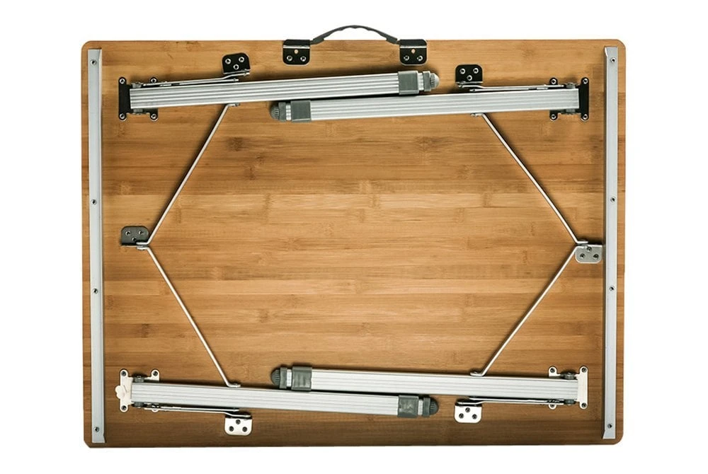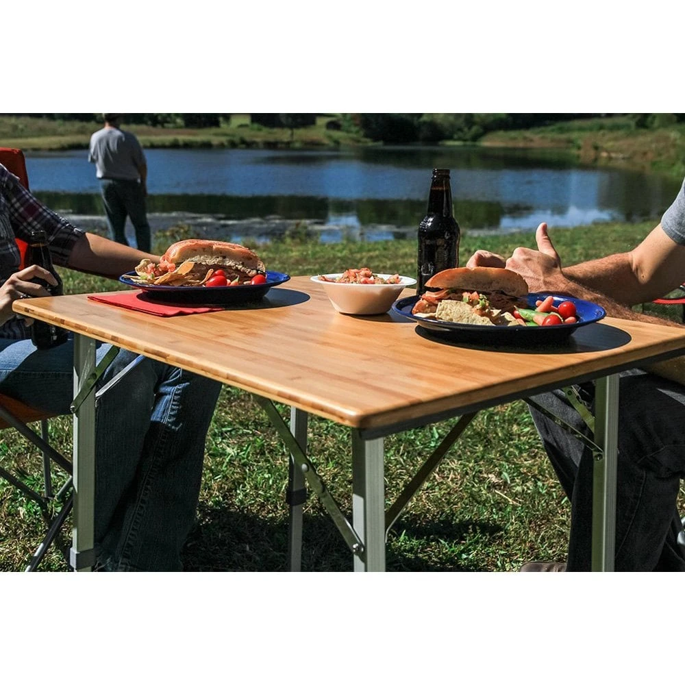 Picnic Camp Table by Camco®. The Folding Bamboo Table Top is great for picnicking, tailgates and camping. It features an attractive natural bamboo top for an at home feel anywhere you go. The aluminum legs fold flat for transportation, and telescope out when in use. Table folds and unfolds in just seconds. Each leg securely clicks into place when fully extended. The carrying handle makes it easy to transport and the overall design is lightweight for added portability.