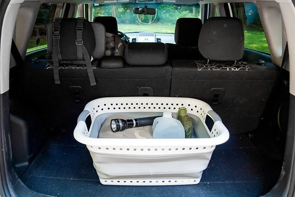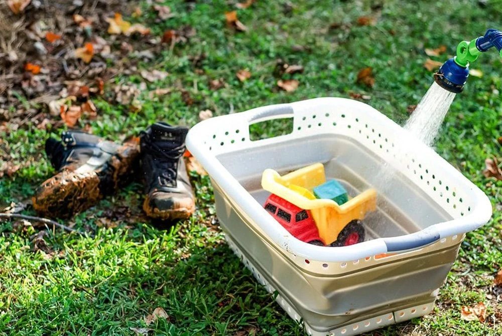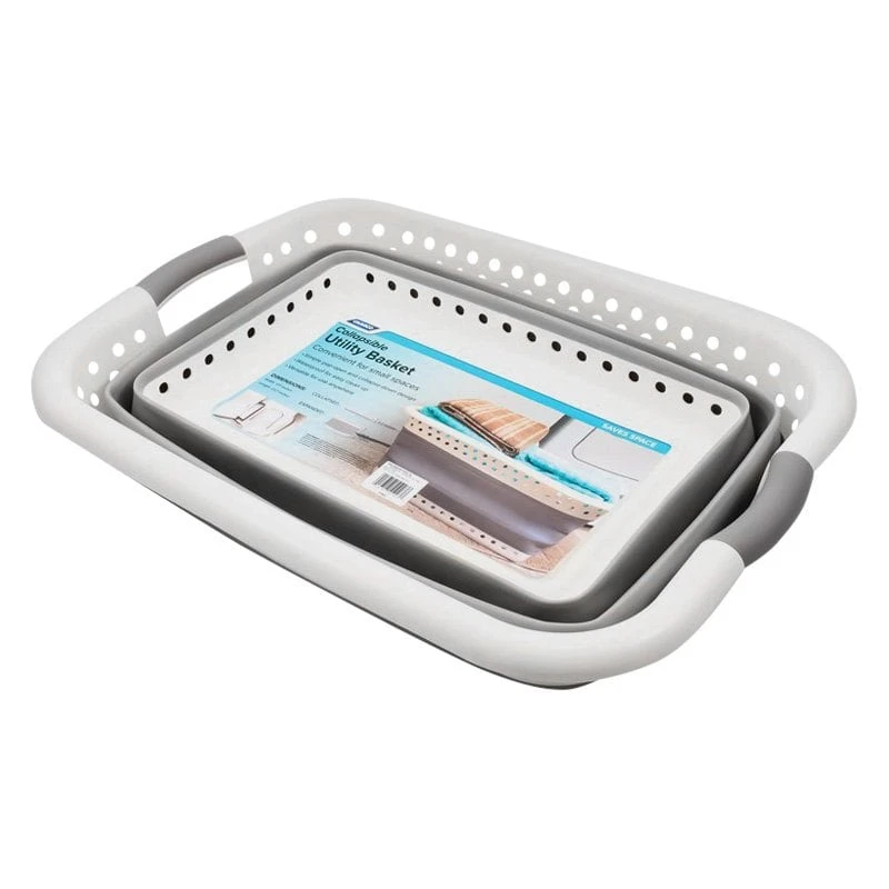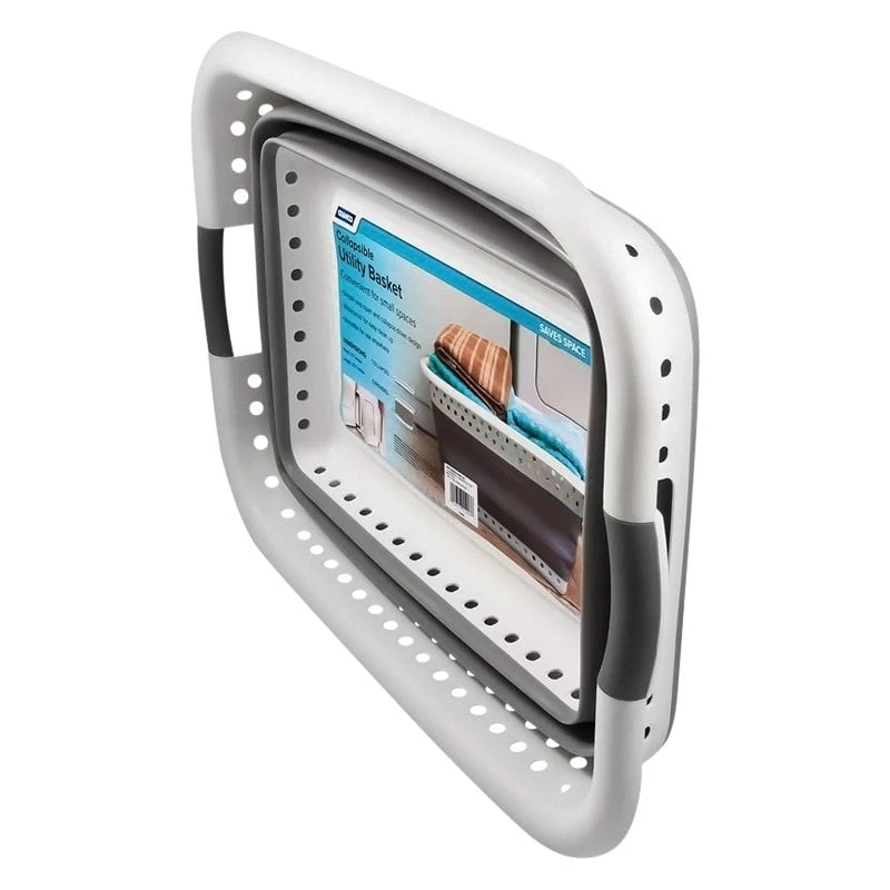 Plastic Collapsible Laundry Basket by Camco®. The Camco Collapsible Utility basket is great for laundry or extra storage, and it collapses flat to hide when you don’t need it. The simple pop-open and collapse-down design is easy to use and versatile for anywhere. The entire basket is waterproof for easy cleanup, making it perfect for dirty jobs.