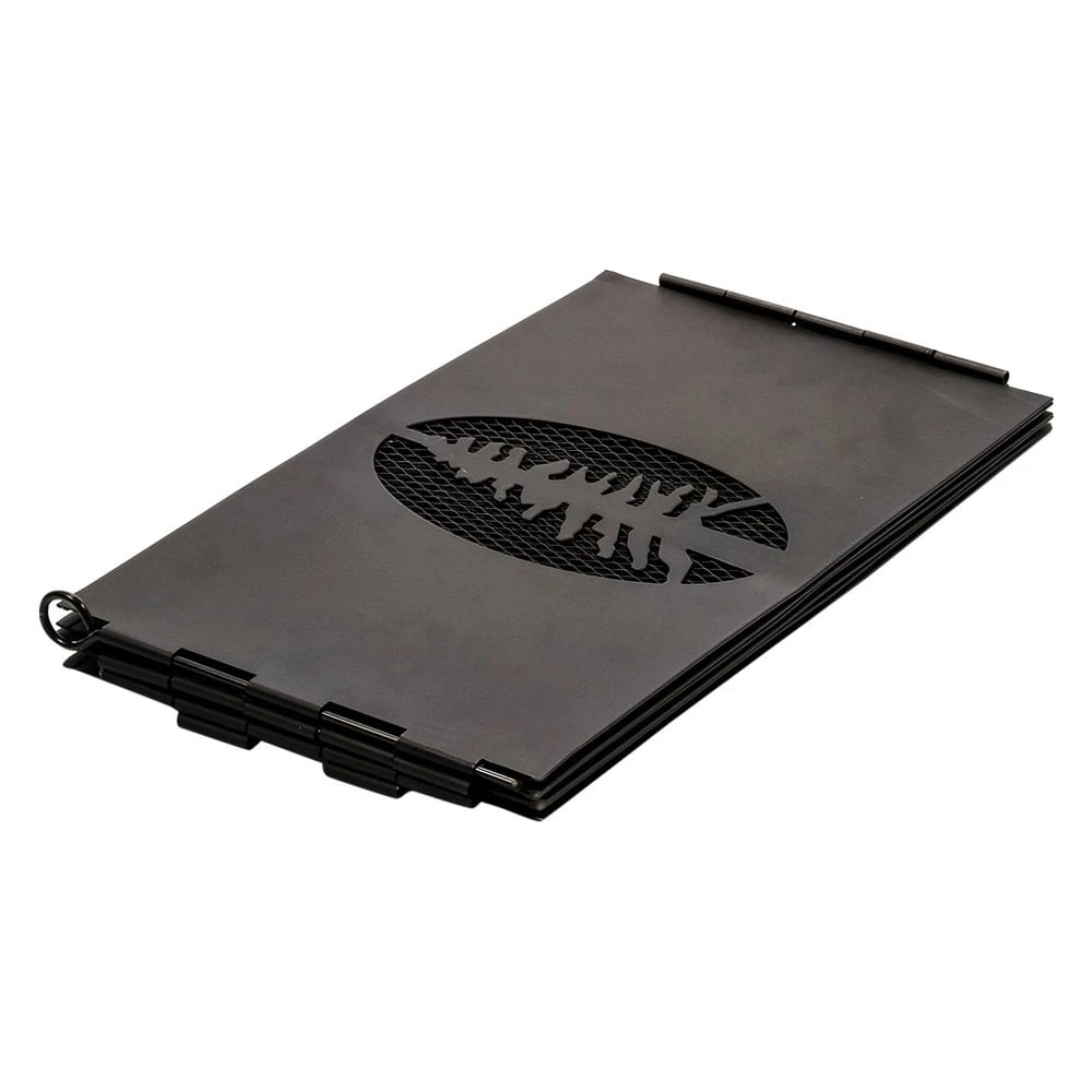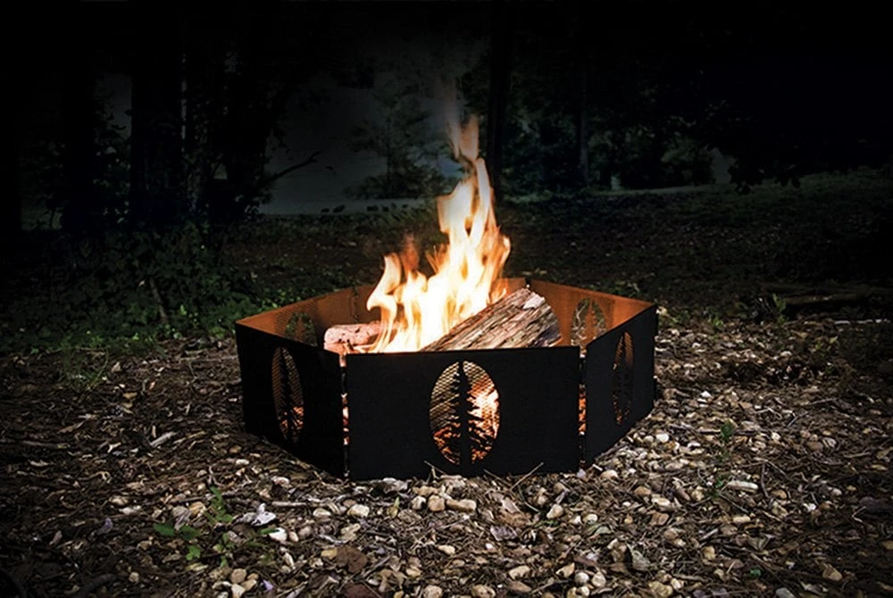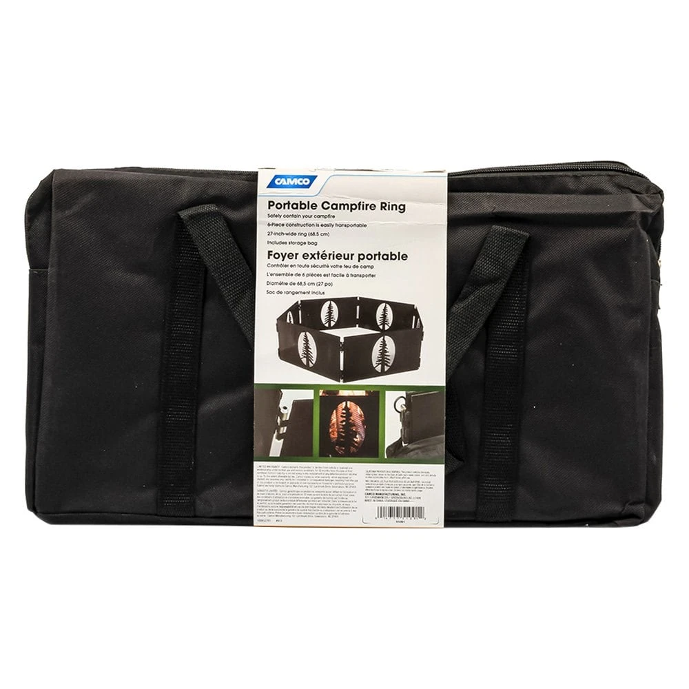 Portable Campfire Ring by Camco®. Safely contain your campfire with Camcos Portable Campfire Ring. The large steel ring will accommodate your natural wood-burning fire. Unfolds and assembles easily with no tools required. Tree cut-outs create a captivating ambiance. Includes a storage bag for easy transportation.