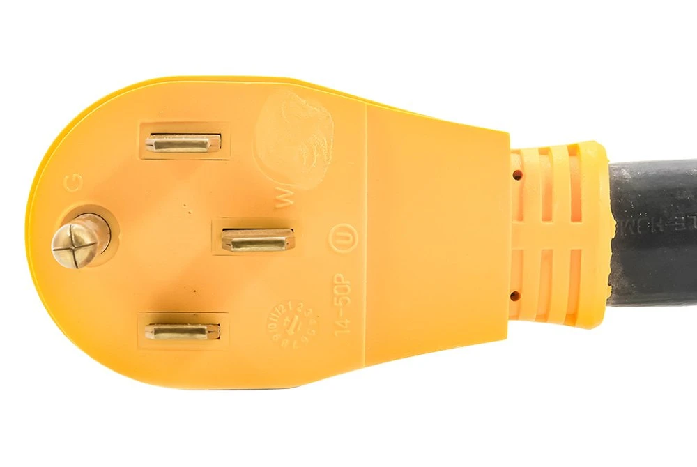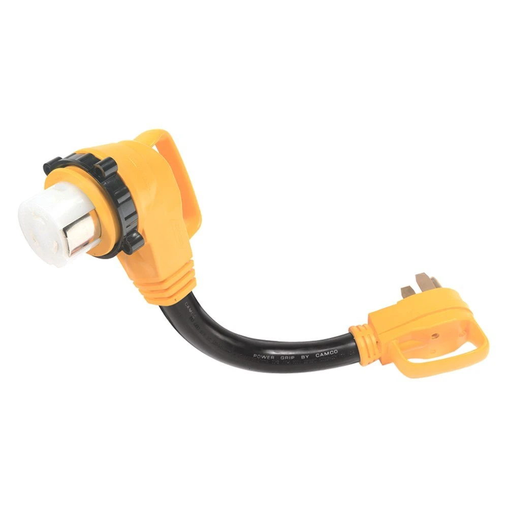 Power Grip™ 18″ Dogbone Power Adapter with Handle Grip (50A Straight Male x 50A Angle Locking Female) by Camco®. Camco’s Standard Male 90 Degree Locking Female PowerGrip Adapter reduces strain on the cord and allows easier connection in tight places. The threaded locking ring creates a weatherproof connection.