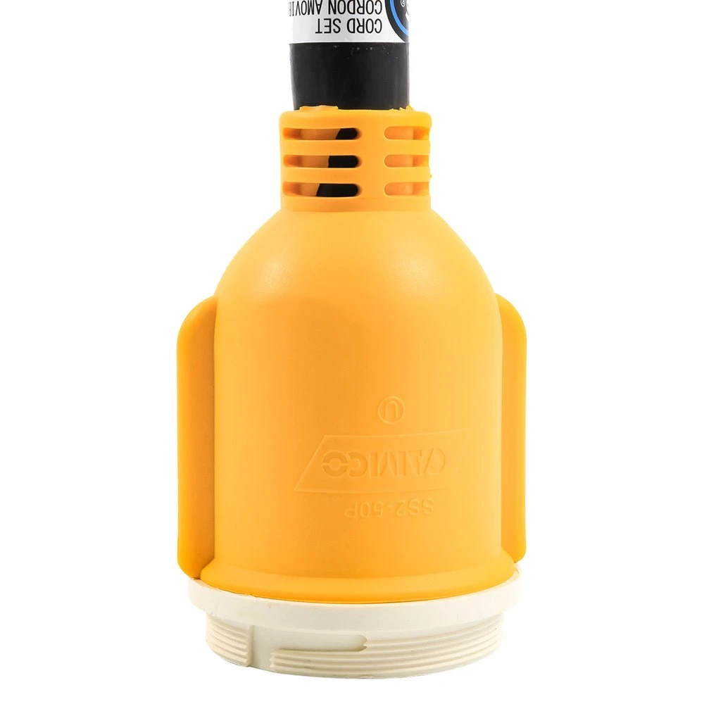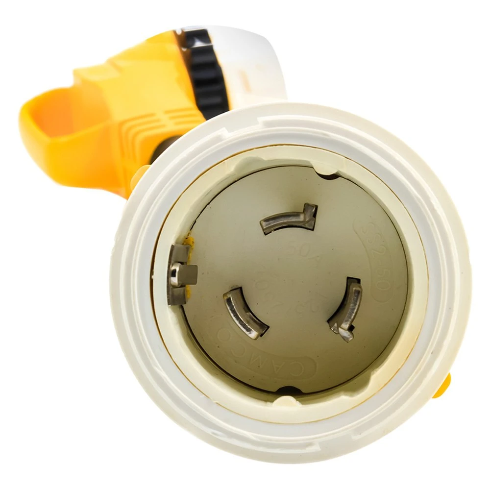 Power Grip™ 18″ Dogbone Power Adapter with Standard Grip (50A Locking Male x 50A Straight Female) by Camco®. Camco’s 50 AMP locking adapter for recreational vehicle use is an 18″ adapter for connecting a SS2-50 plug to a SS2-50 connector. The 90 degree connector reduces strain and allows easier connection in tight places. A threaded locking ring creates a weather proof connection.