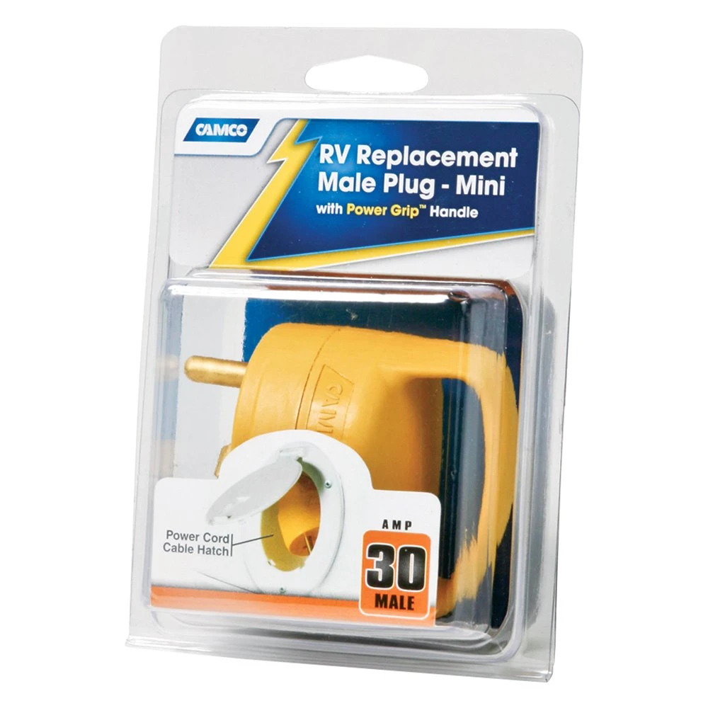 Power Grip™ 30A Male Replacement Plug (Mini) with Handle Grip by Camco®. Camco’s 30 AMP Mini Replacement Plug fits completely inside your RVs cord cable hatch so the door can be closed during travel. The sturdy Power Grip handle makes it easy to remove the plug from your power outlet. Patented.