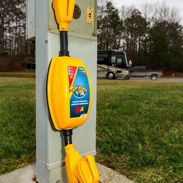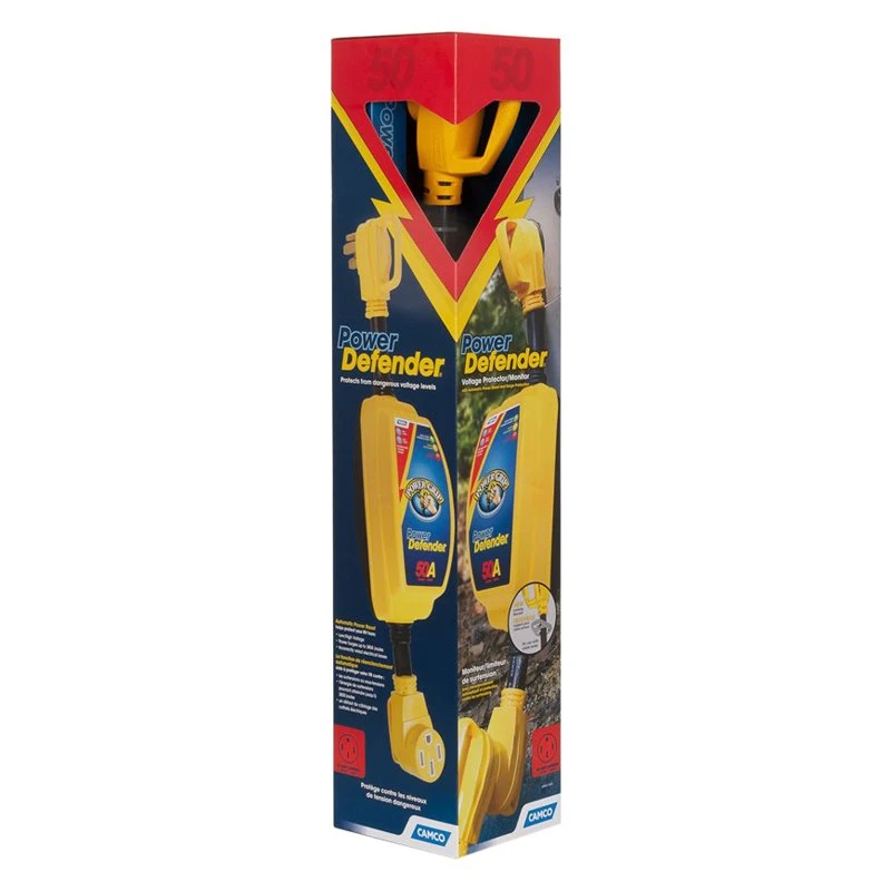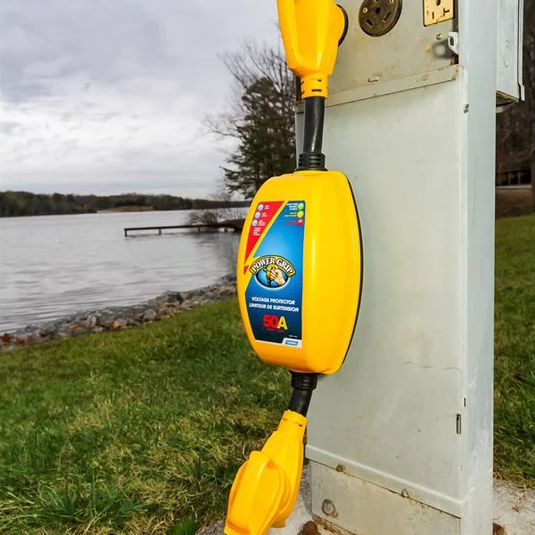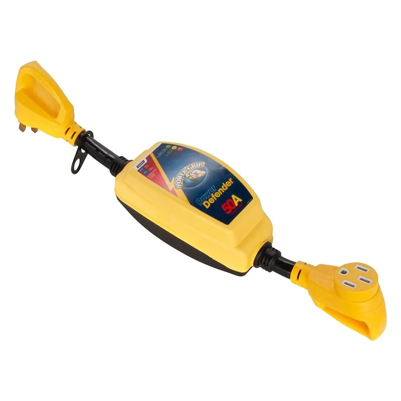 Power Grip™ 50A Straight Male x 50A Straight Female Dogbone Voltage Protector with Handle Grip with Over/Under Voltage and Surge Protection by Camco®. 1 Piece. Nowadays, RVs have all kinds of sophisticated electronics onboard. Microwaves, televisions, refrigerators, cell phones and computers all run off of your RVs power source, and all are at risk of high or low voltage and a power surge or spike. Repairing and replacing RV appliances and accessories can be costly, especially if they all become affected at once. Protect your RV and appliances from high or low voltage levels and surges with Camco’s PowerGrip Voltage Protector and Circuit Analyzer. The Camco PowerGrip Voltage Protector and Circuit Analyzer protects from high voltage, surges such as lightning and low voltage which can be equally harmful.