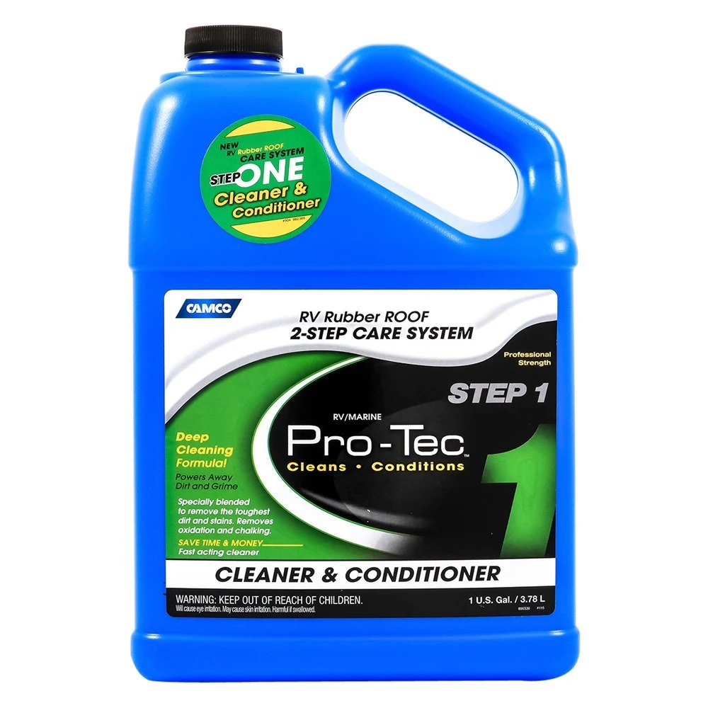 Pro-Tec™ 128 oz. Rubber Roof Cleaner by Camco®. Camco’s Pro-Strength Pro-Tec Rubber Roof Cleaner is step two of a two-step treatment that removes black streaks, oxidation and road film build up on your rubber roof and helps protect it from further damage. Its specially formulated blend of surfactants and conditioners deep cleans and conditions your rubber roof, helping to extend its life when used before Pro-Strength Pro-Tec Rubber Roof Protectant, not included.
