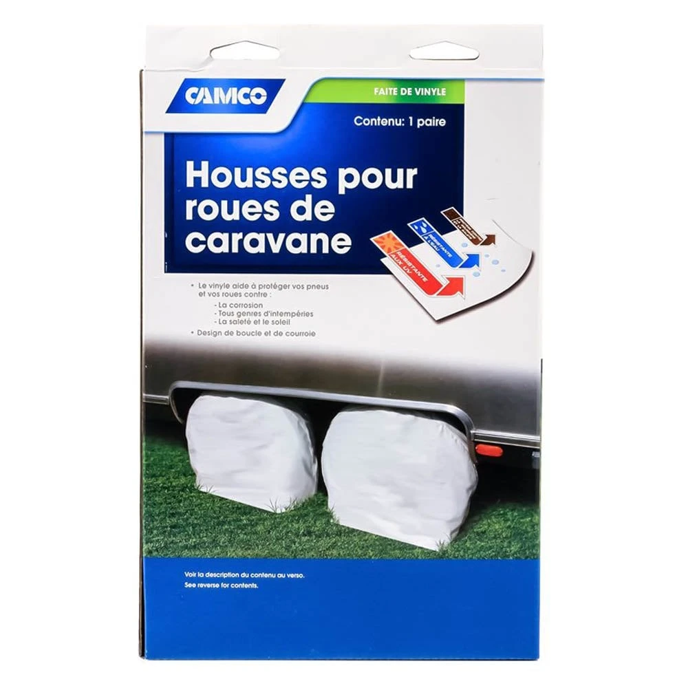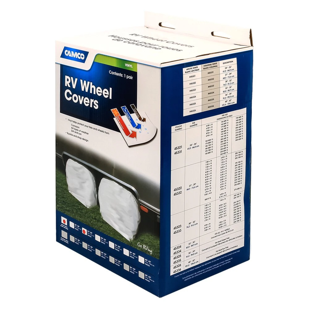 Single Axle RV Wheel Covers by Camco®. Vinyl covers protect your tires and wheels from sun, dirt, corrosion and all types of weather while your vehicle is parked.