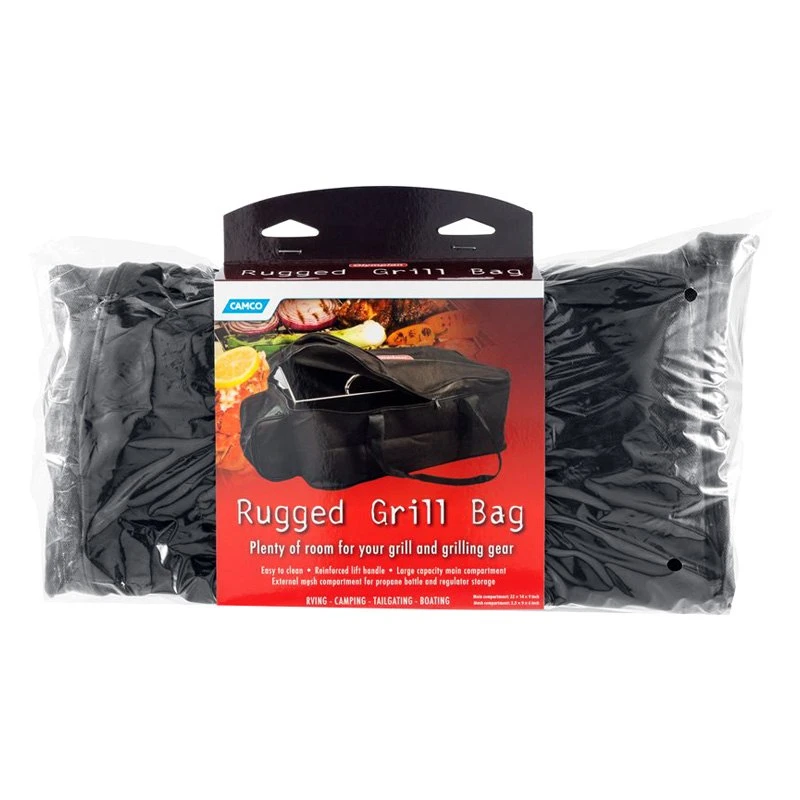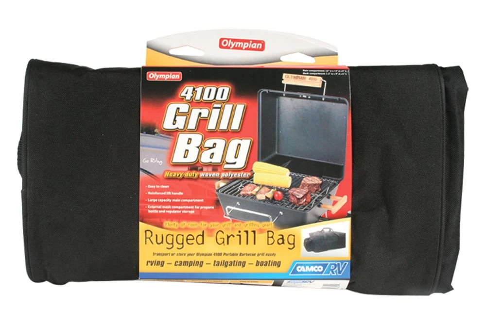 Storage Bag for Olympian Grill by Camco®. The Camco Olympian RV Grill Storage Bag is a heavy-duty weather resistant polyester grill bag that provides long lasting protection in every storage environment. It keeps the grill free from dust, dirt and scratches. Includes a separate compartment for a 1 lb disposable cylinder and fits all Olympian grills, except the Olympian 6500.