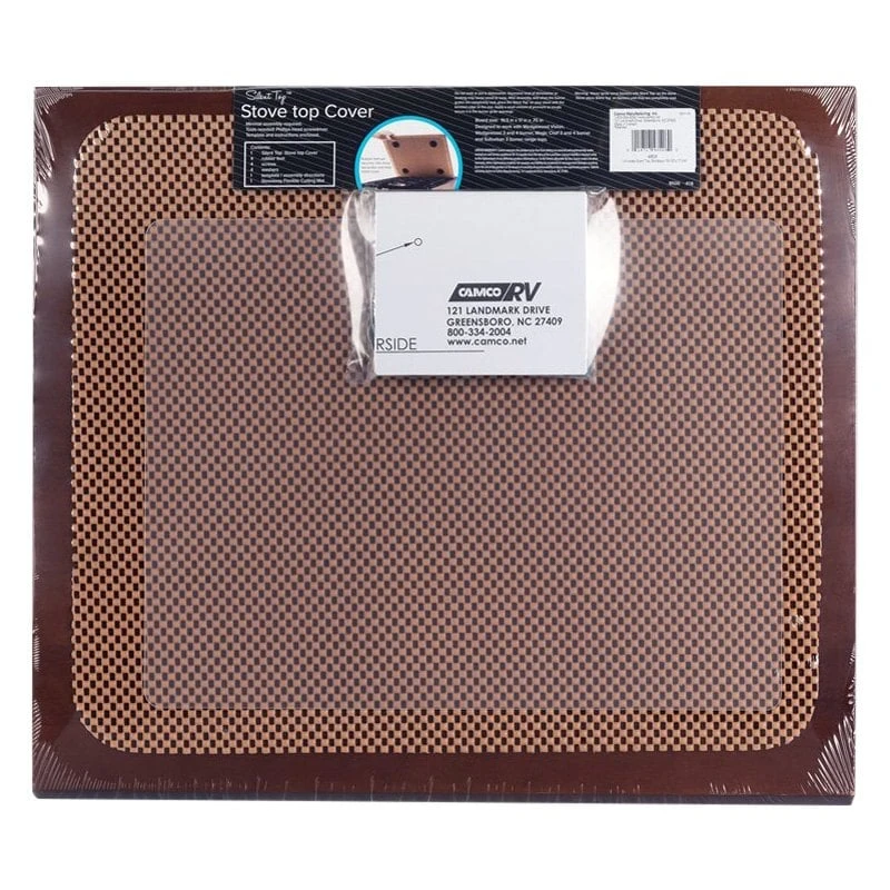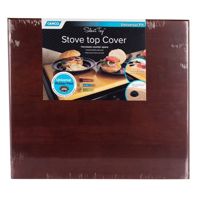 Universal Bordeaux Silent Top with Flexible Cutting Mat by Camco®. Camco RV Universal Stovetop Cover silences annoying stovetop rattles and adds valuable counter space to your RV. Solid hardwood stovetop cover hides and protects burners. Non-toxic gloss finish for extra moisture protection.